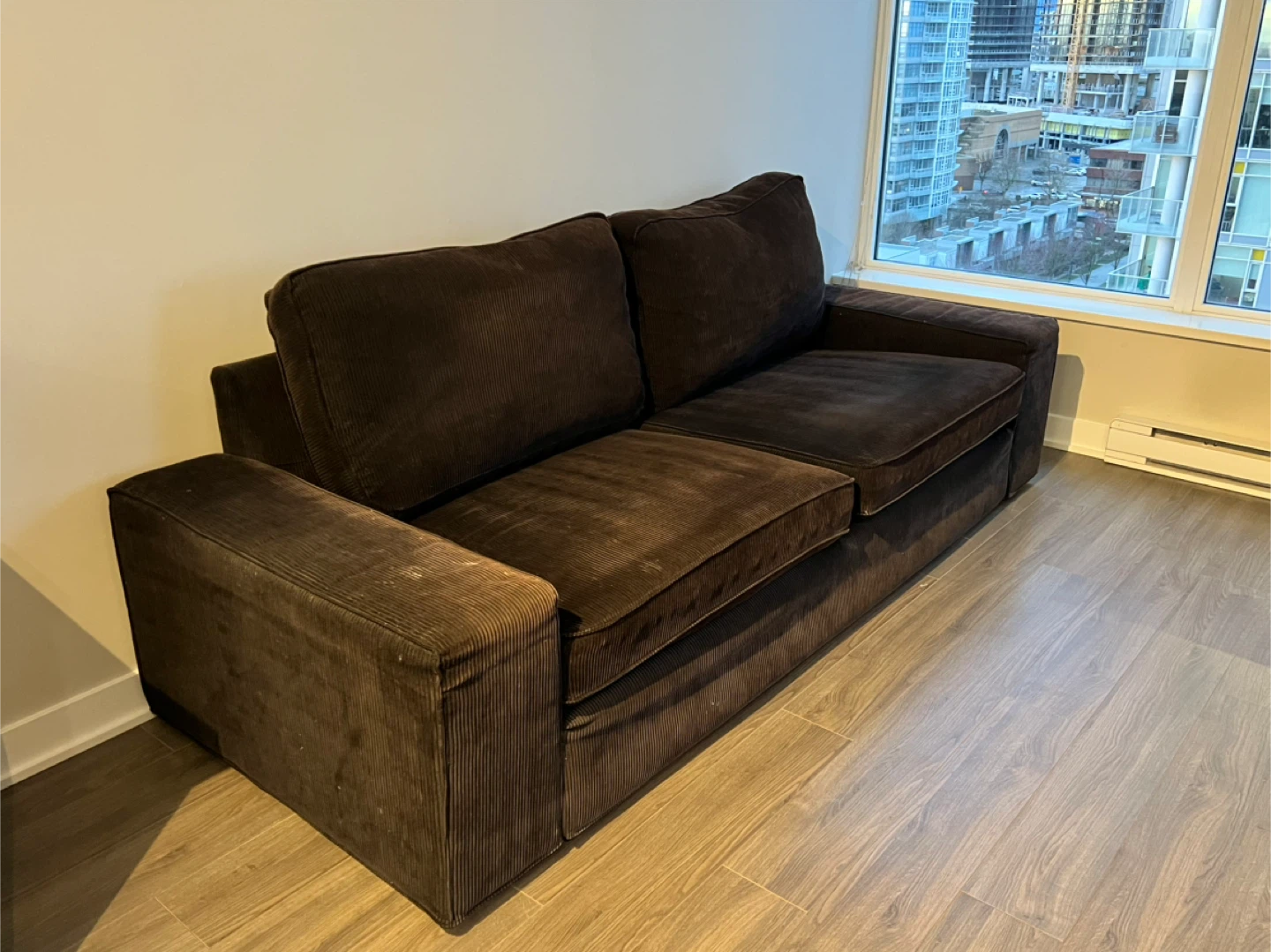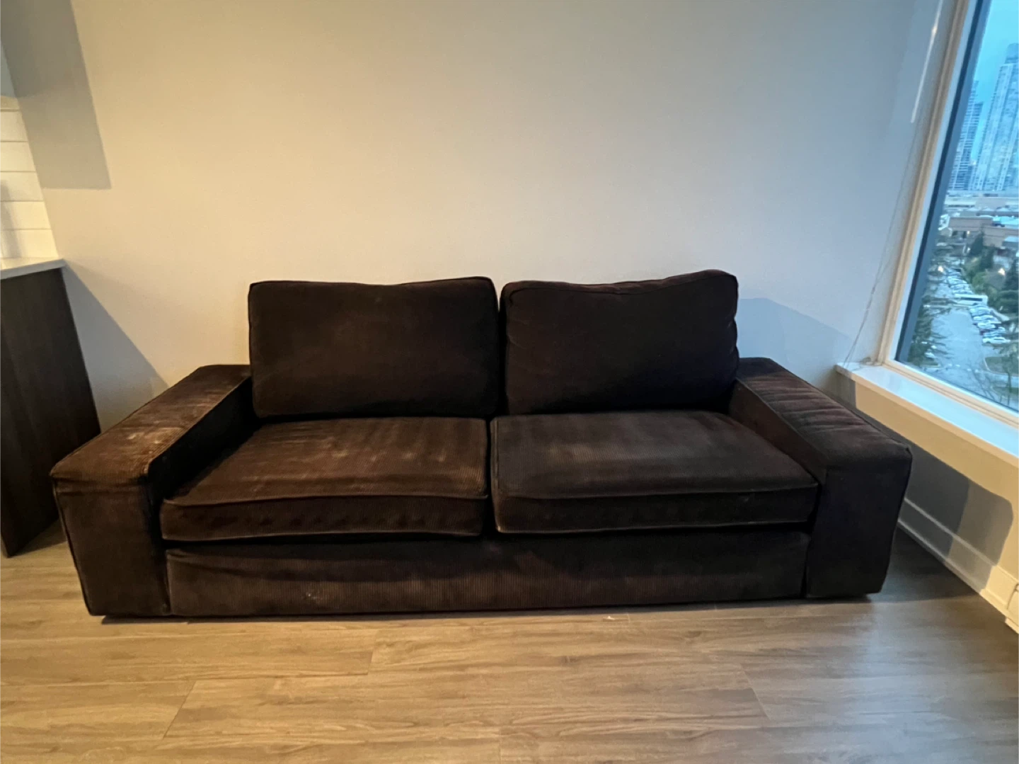 Moving sale, comfortable two-seater sofa in a dark brown corduroy fabric. It's got a modern, boxy design with wide arms. Perfect for a smaller living space or apartment! Some marks where & there, but didn’t show from the photos, pick up from Metrotown 4900 Lennox