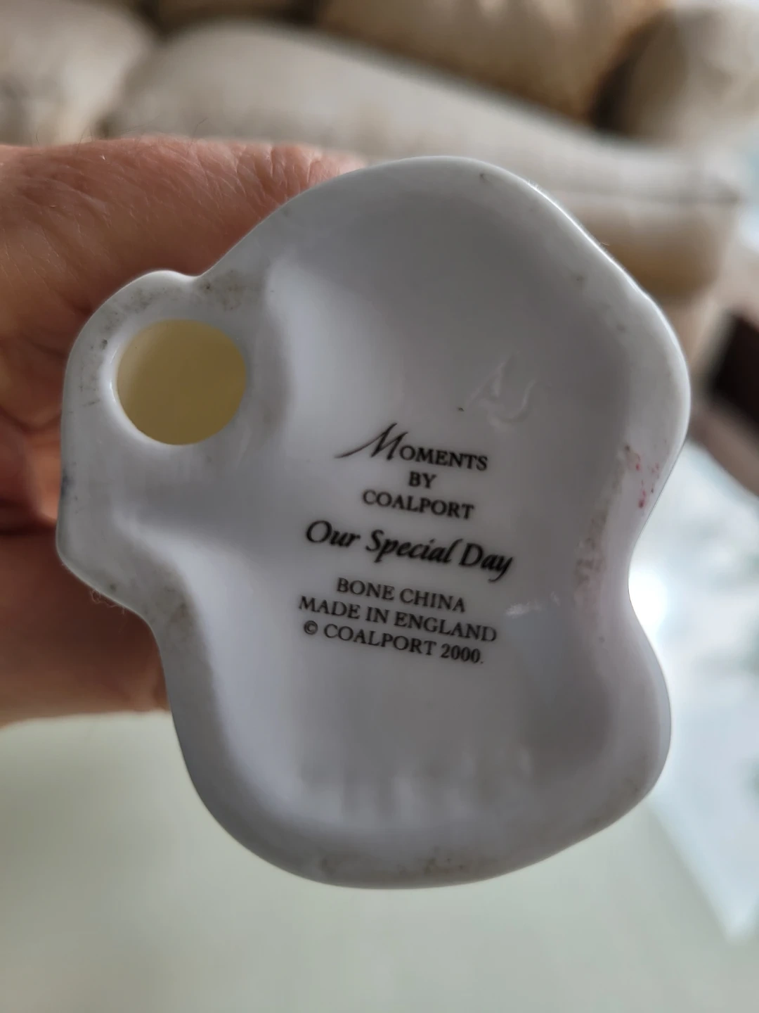 A sweet white porcelain figurine by Coalport featuring a bride and groom embracing. Titled Our Special Day It's a classic keepsake for any wedding celebration. This elegant piece is perfect as a gift to bride from significant other or a cake topper or just a decorative accent.