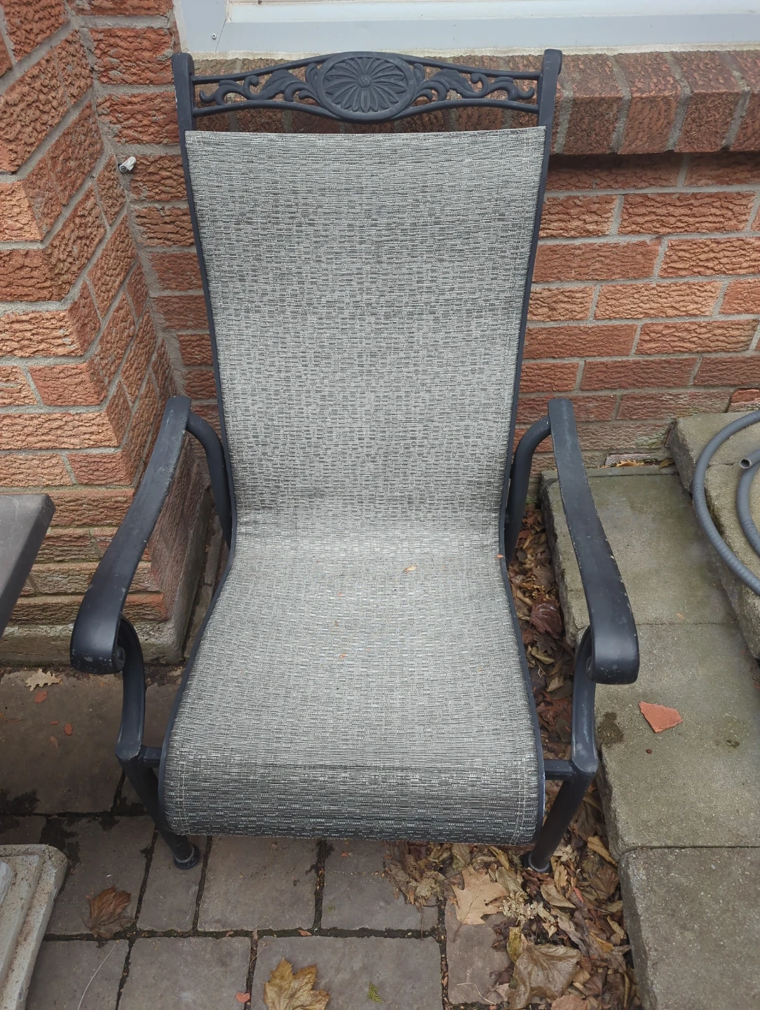 This is a grey outdoor patio chair with a decorative backrest. It's constructed with a metal frame and fabric seating. This chair is great for relaxing on your patio or deck!