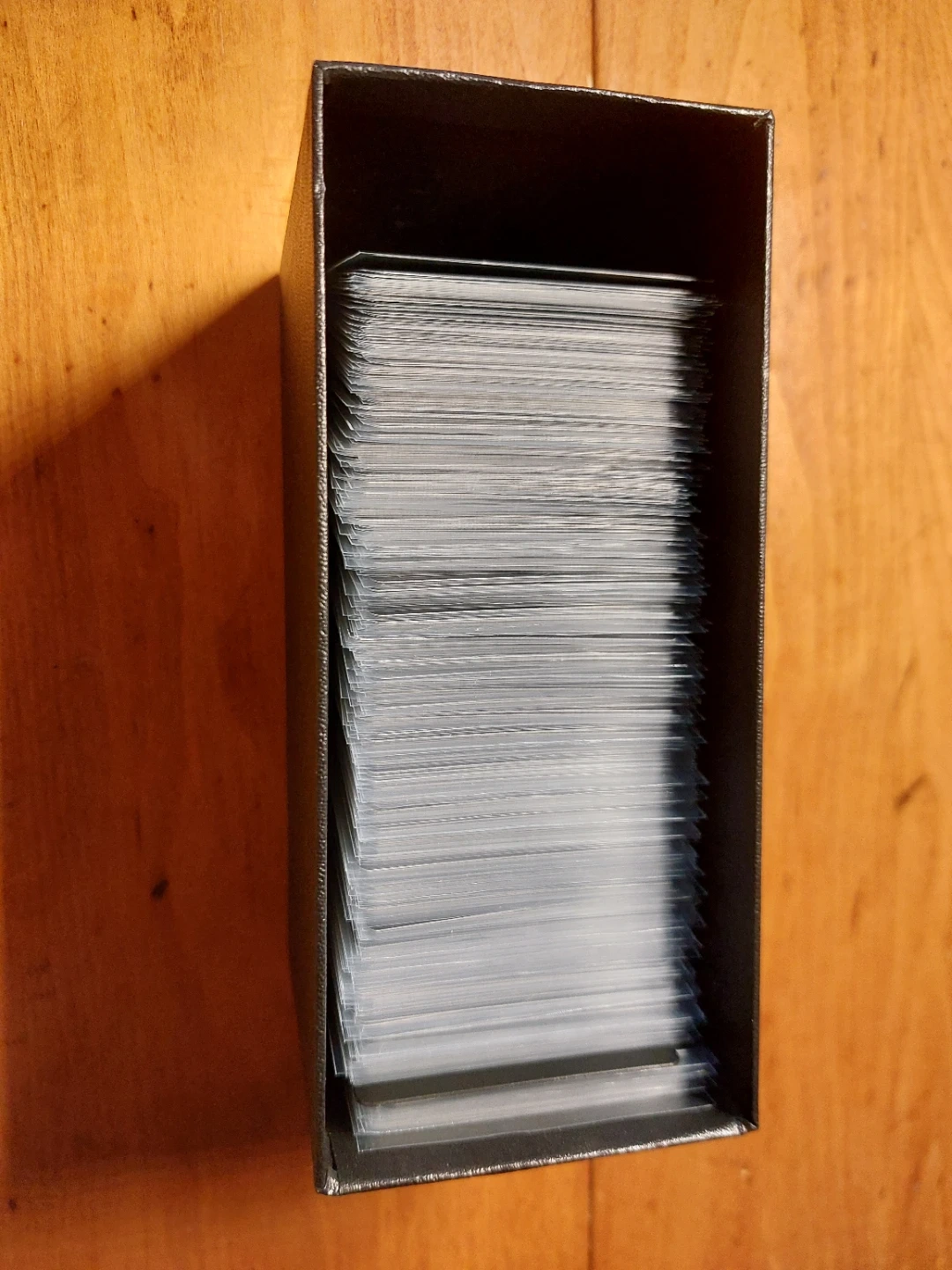 Everything is pack fresh and was sleeved immediatly. Comes sleeved and in a storage box