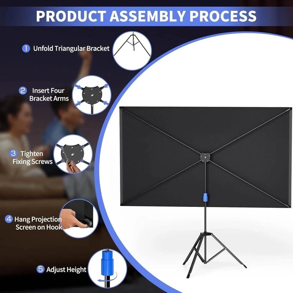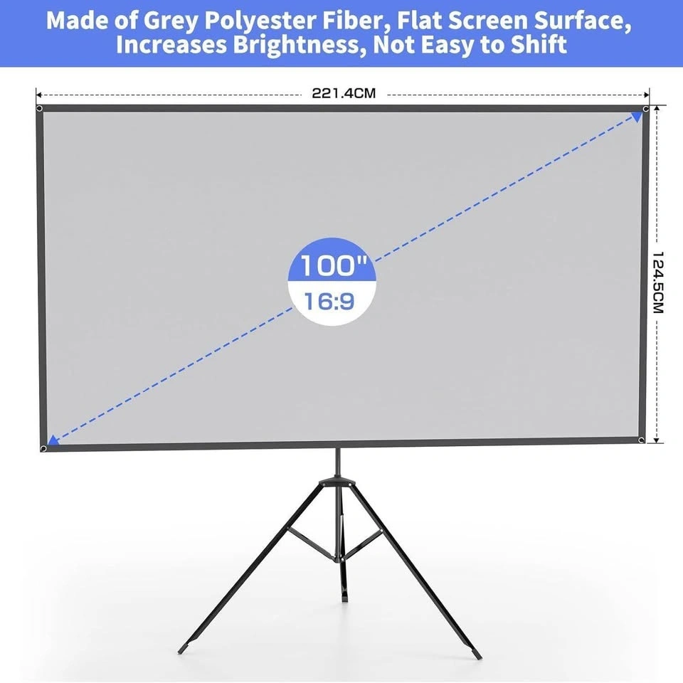 This 100-inch projection screen has a 16:9 aspect ratio, a 160-degree viewing angle, and a 1.2x gain for great color reproduction. The sturdy tripod stand is foldable and telescopic to adjust height, with four aluminum tubes for a stable, flat, and wrinkle-free screen surface. All parts fit into a carrying bag for easy portability and quick assembly/disassembly. You can set it up anywhere like the living room, backyard, or classroom for movie nights or presentations. Enjoy a large projected image with family or friends!