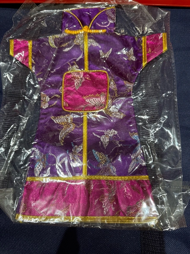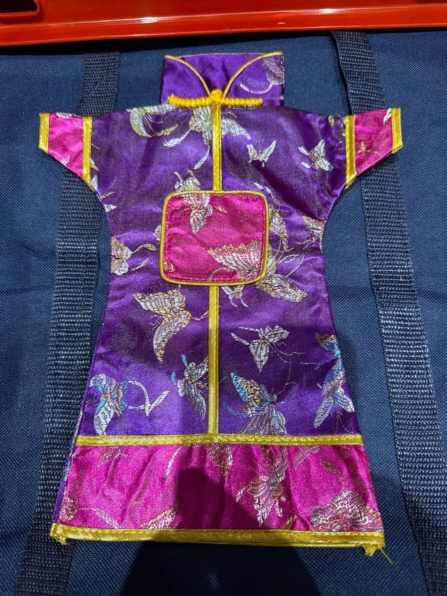 This stunning, new, purple, silk doll dress, adorned with butterfly detailing, is the perfect addition to any doll's wardrobe. The intricate gold trim complements the vibrant purple and pink hues, creating a regal and elegant look. Or as a decorative piece for your favorite wine bottle to add a hint to your environment