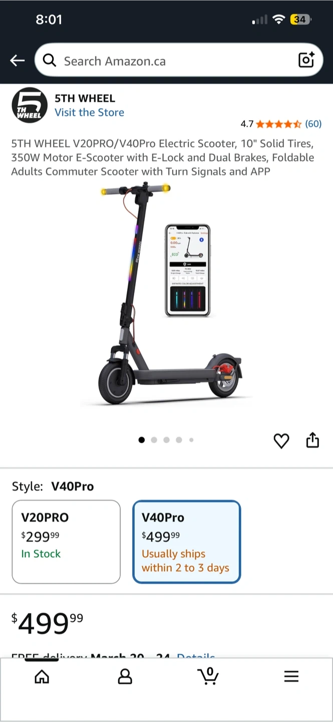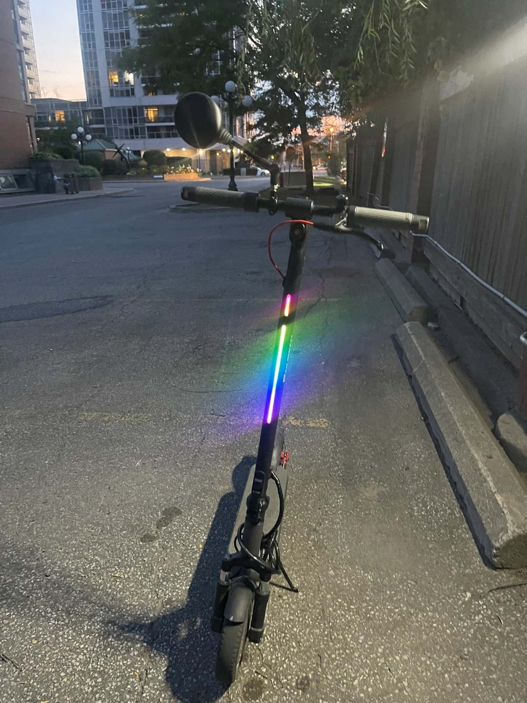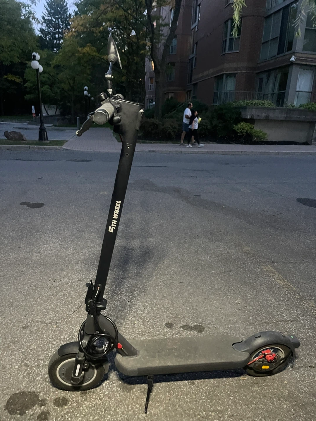 A black 5th Wheel electric scooter with a digital display. It features a foldable design for easy storage and transport. Includes a built-in headlight and taillight for visibility.