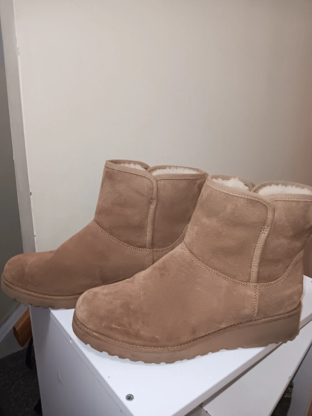 These UGG Classic Mini boots are made from tan suede with a cozy sheepskin lining. Used 4 times indoors only 9/10