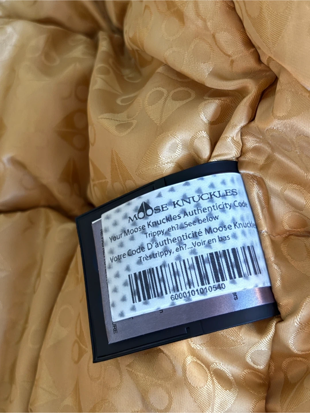Down filled Moose Knuckles jacket with a black exterior and gold lining. Features the brand's signature logo on the sleeve. Perfect for staying warm during colder months!