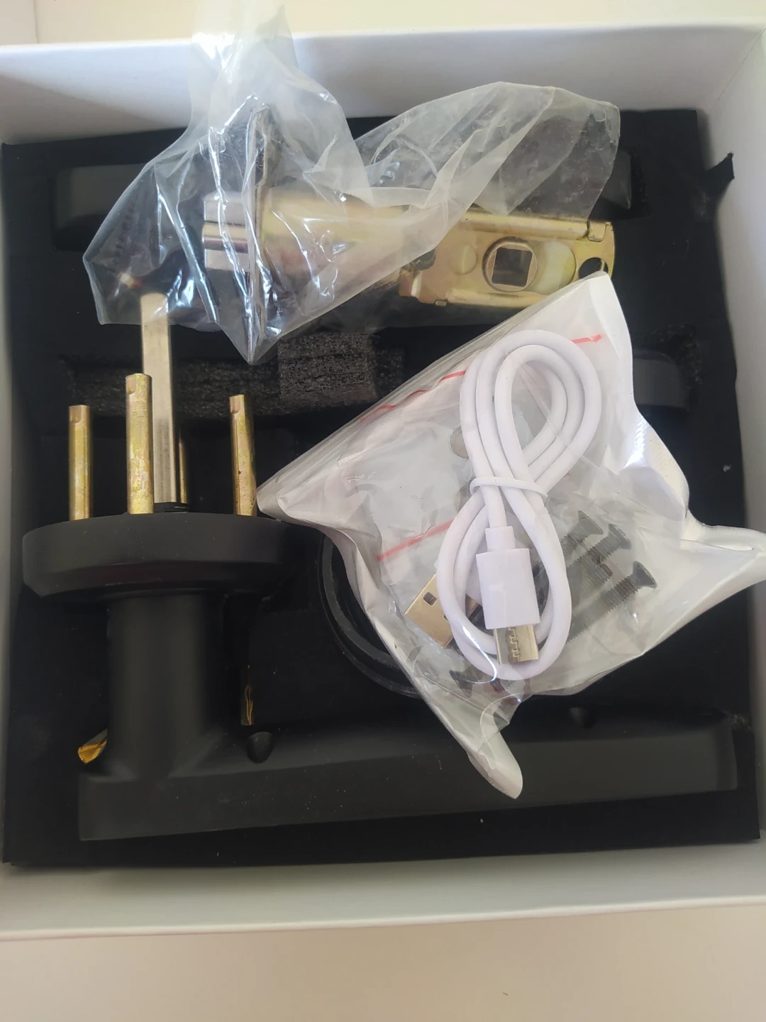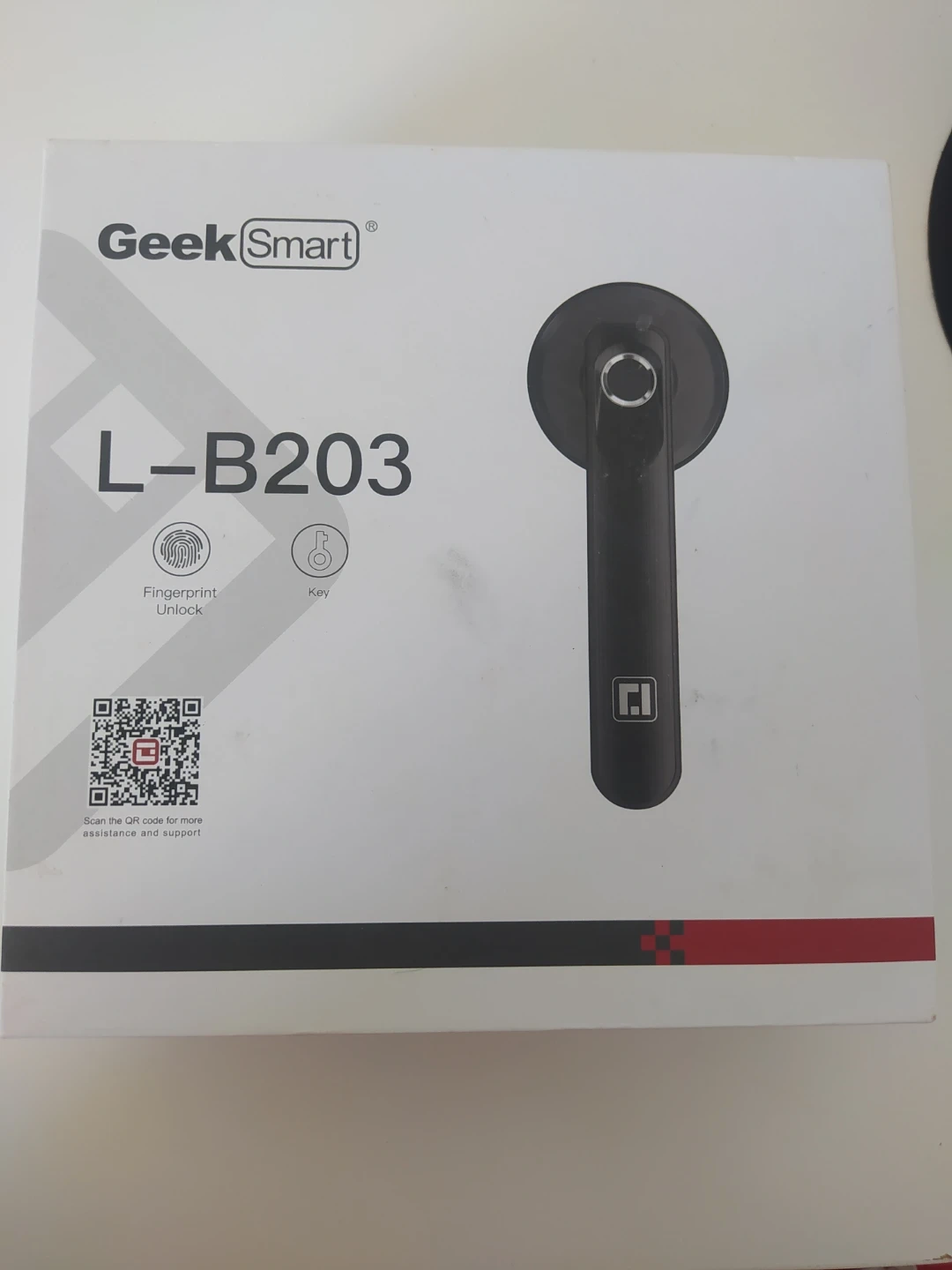This is a Geek Smart L-B203 smart door lock. It supports fingerprint unlock and key access. Includes USB charging cable and mounting hardware.