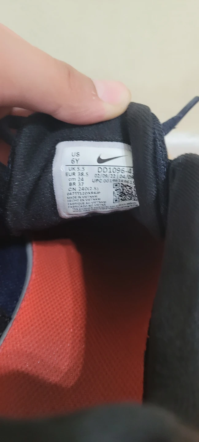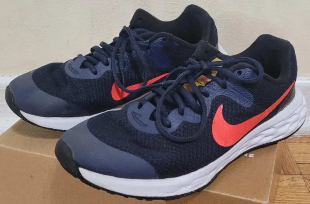 Kids' Nike Revolution 6 NN running shoes in navy blue and red. US Youth size 6, UK 5.5, EUR 38.5, CM 24. These shoes are made for active kids. They're lightweight and comfortable for everyday wear or sports. Price Negotiable.