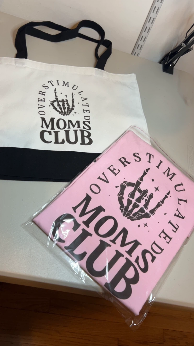 Overstimulated Moms Club Tote Bag and Pink T-Shirt