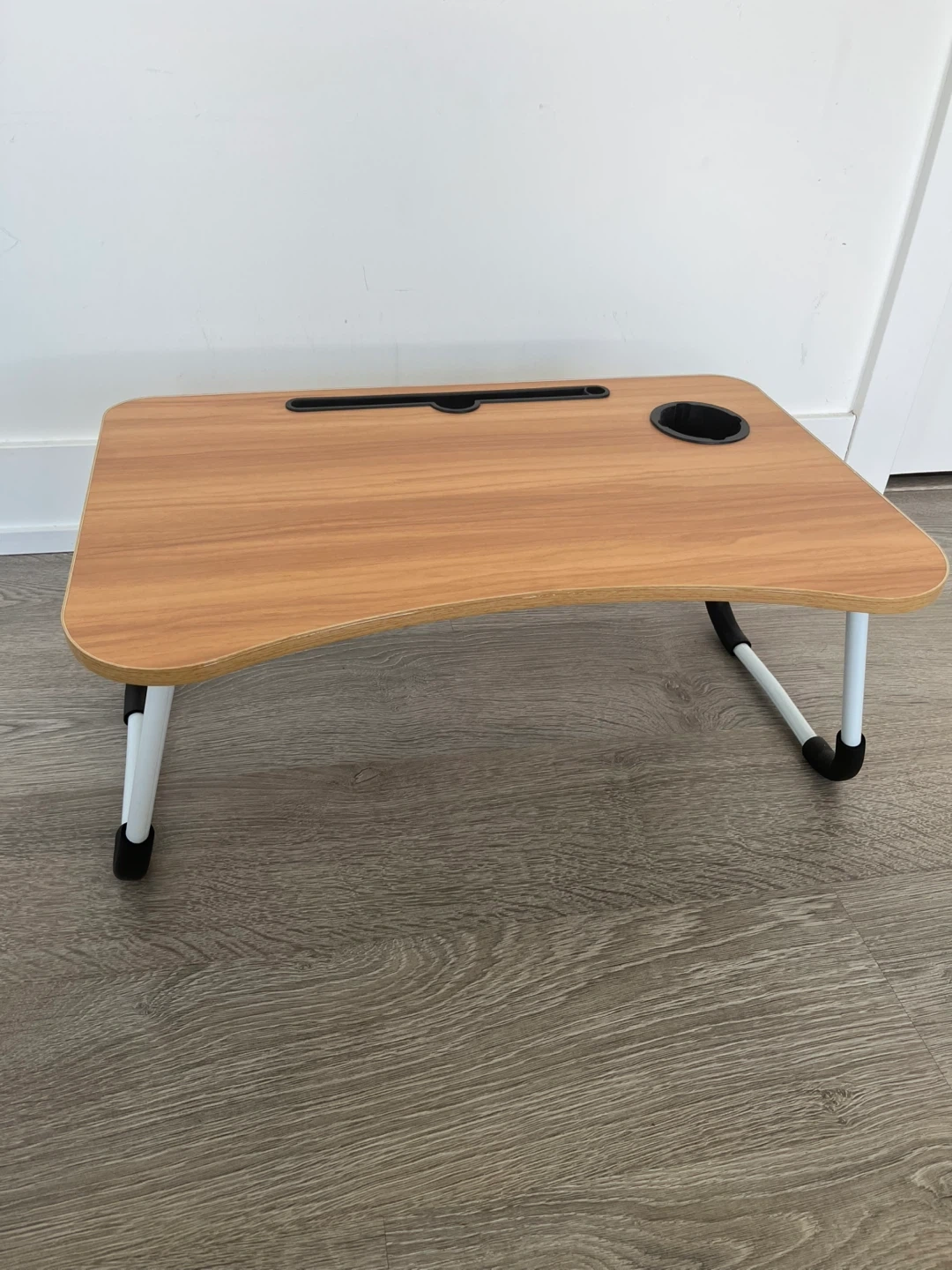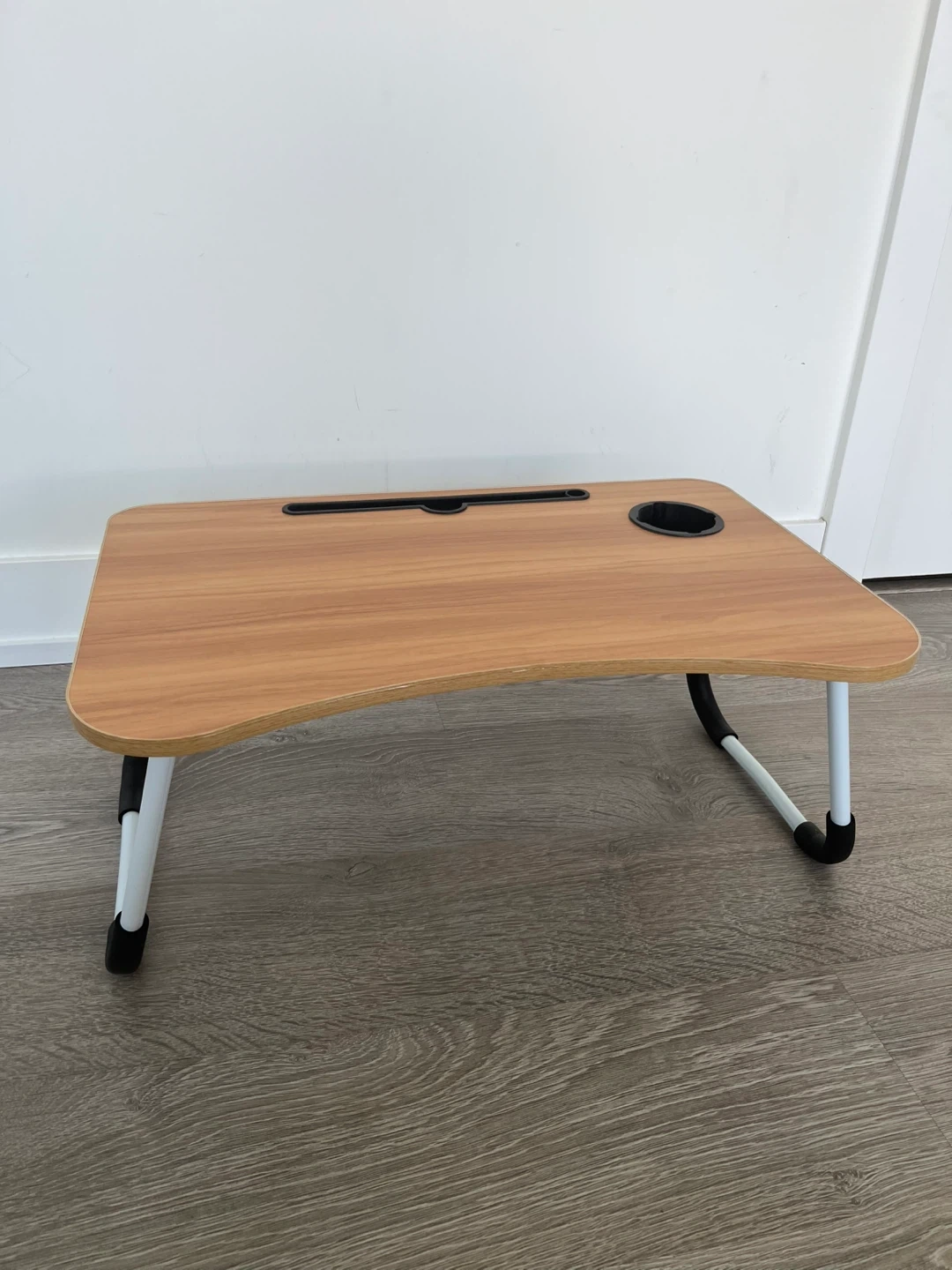 Handy lap desk table with foldable legs for easy storage. It's designed with a slot for a tablet or phone and a built-in cup holder. Perfect for working or snacking from your couch or your bed.