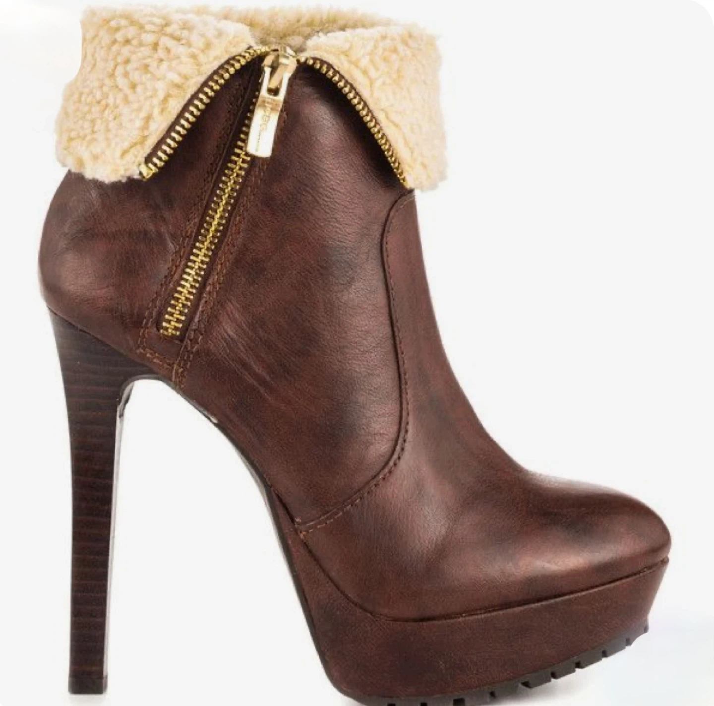 Stylish BCBGMaxAzria ankle boots with a rich brown leather exterior. These booties feature a cozy shearling lining and a fashionable platform heel. Side zipper for easy on and off!