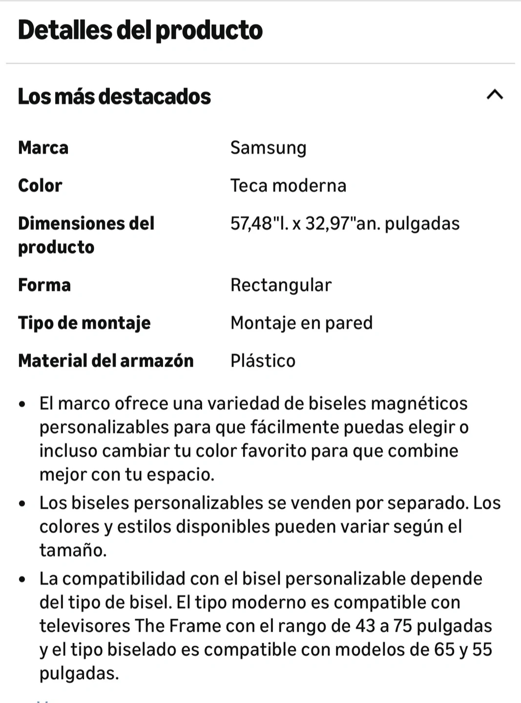 • Compatibility with the customizable bezel depends on the bezel type. The modern bezel is compatible with The Frame TVs ranging from 43 to 75 inches, while the beveled type is compatible with 55 and 65 inch models.