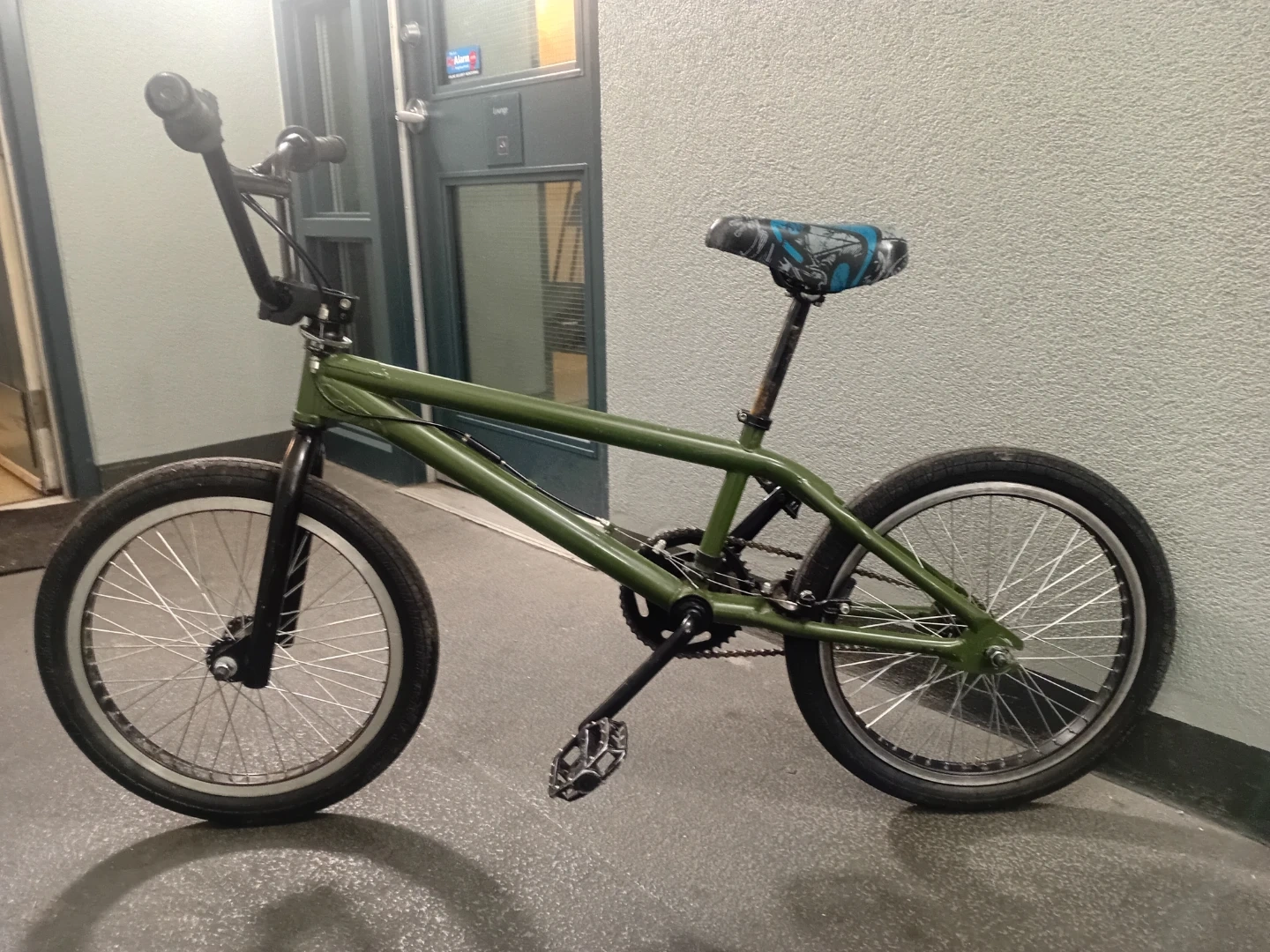 This is a green BMX bike with a blue and black patterned seat. It has a sturdy frame, perfect for riding around town or at the skatepark. in good condition.