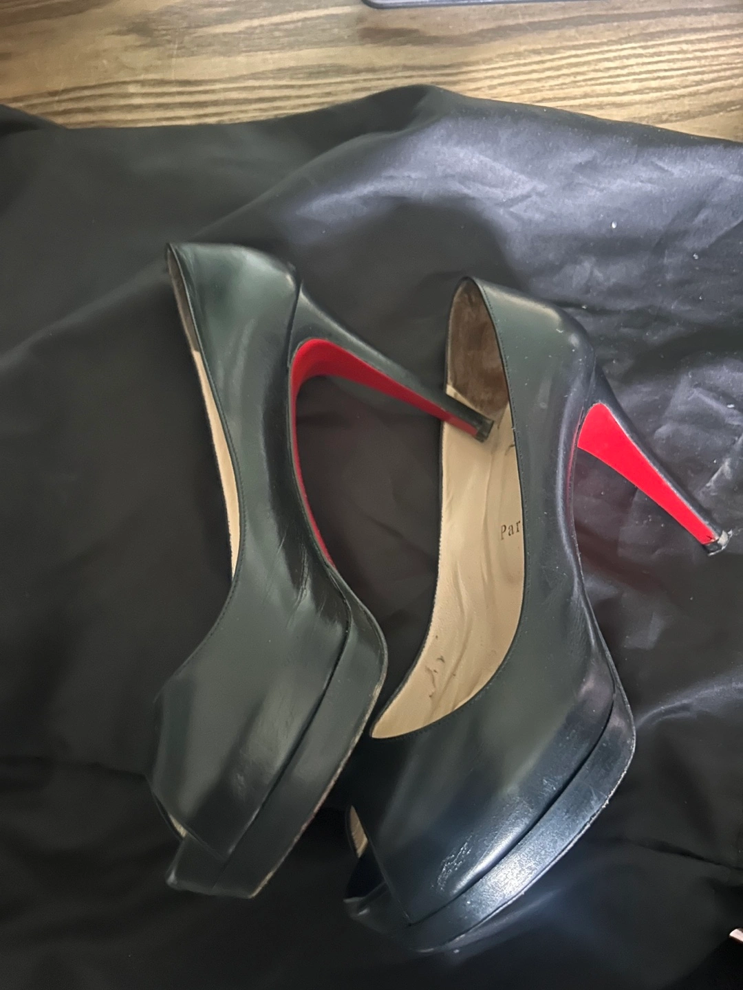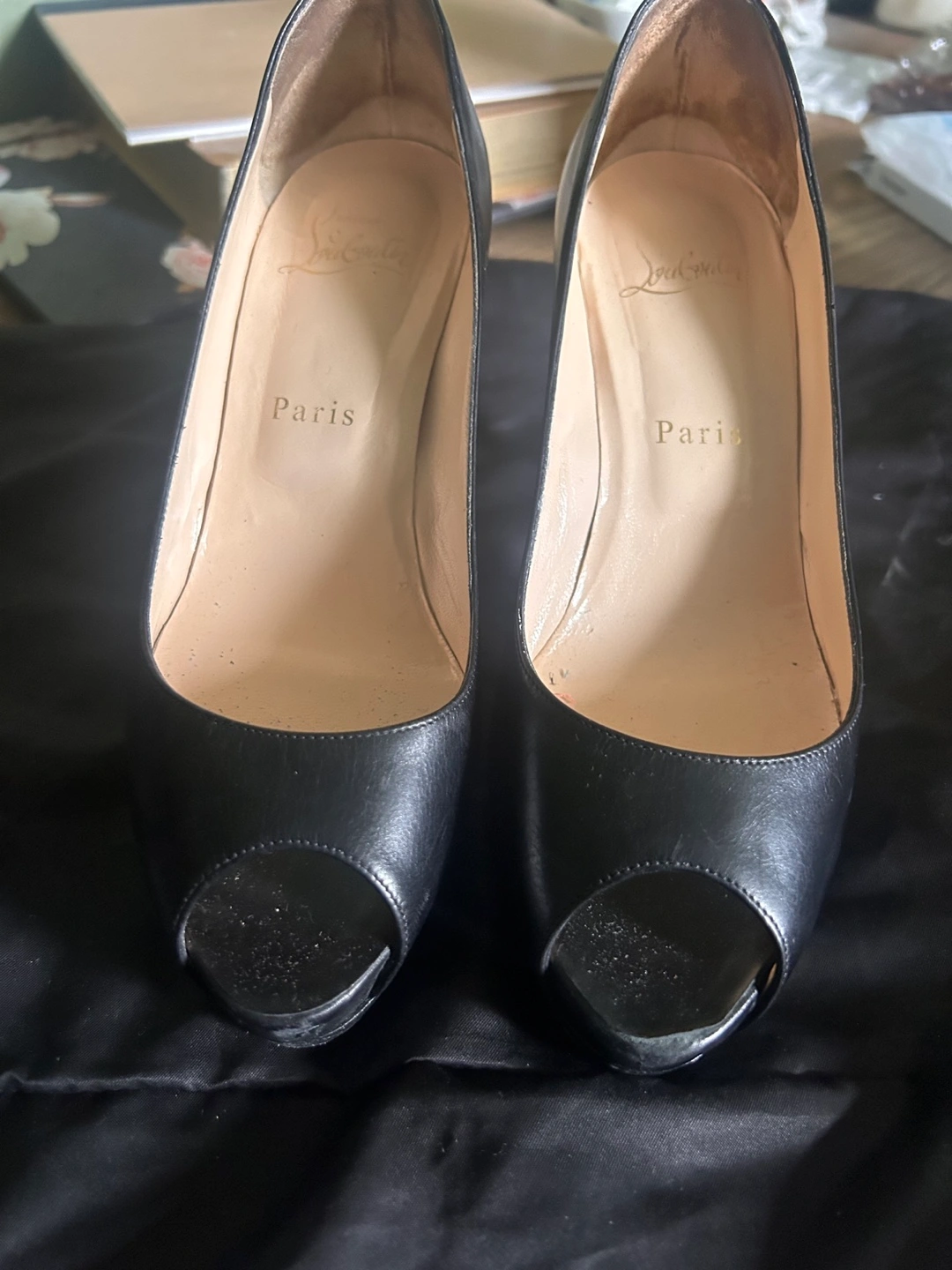 Pre-owned Christian Louboutin peep toe platform pumps. Black leather. Red soles. Minor wear.