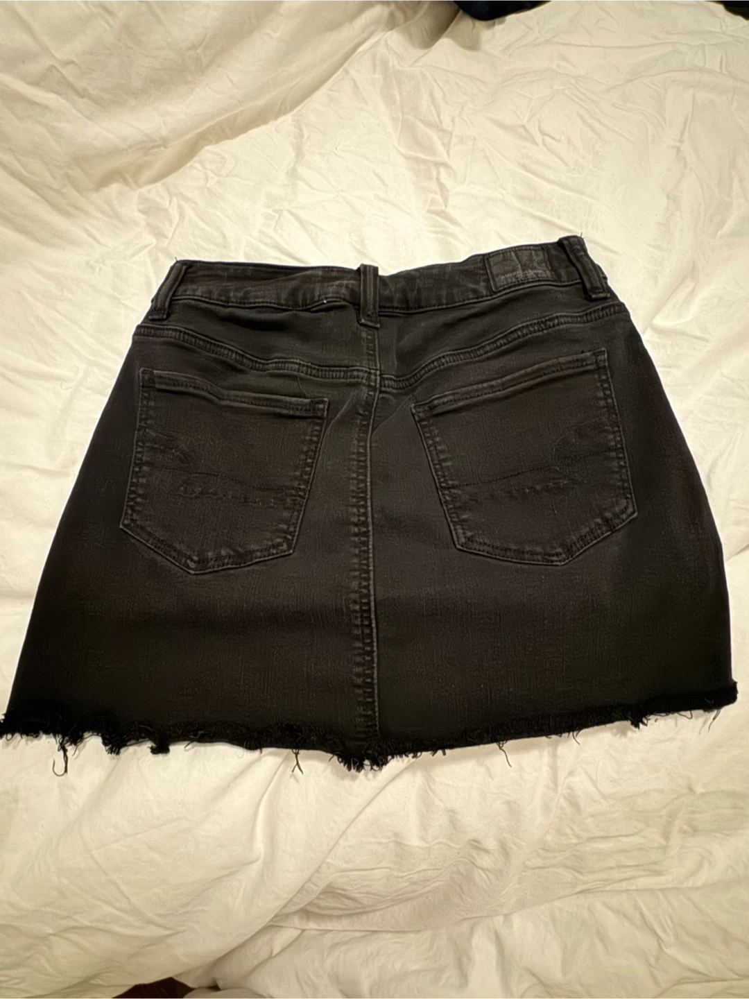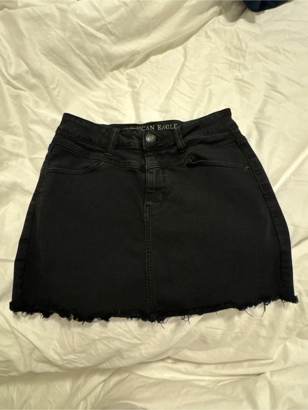 This black denim mini skirt is from American Eagle and is a size 4. The skirt features a frayed hem for a casual look.