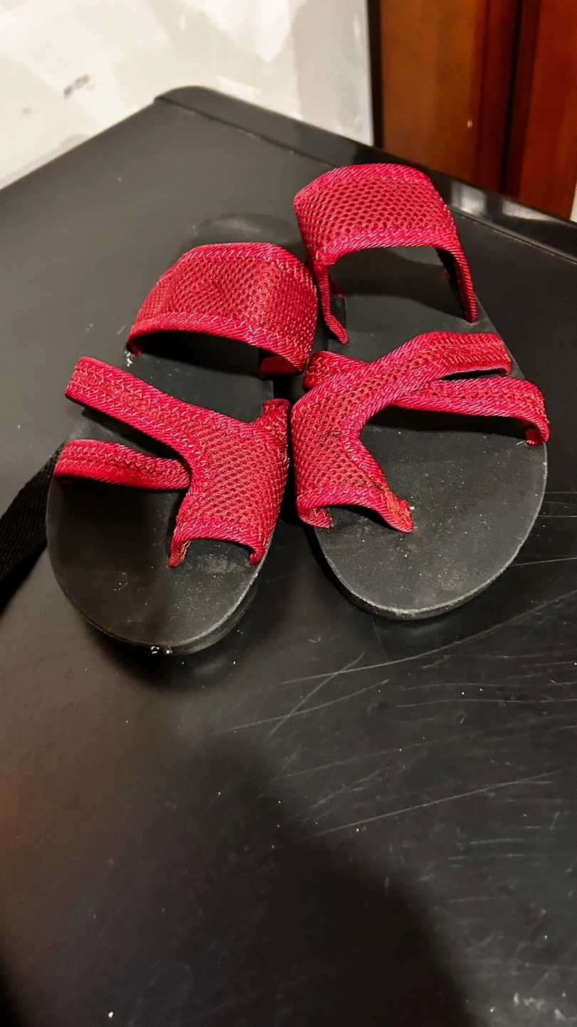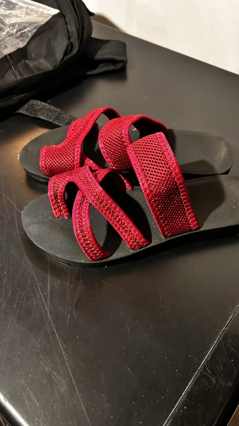 Comfortable red slide sandals with a mesh fabric upper. These slip-on sandals feature a flat sole and a toe post for a secure fit. Easy to wear for casual outings.