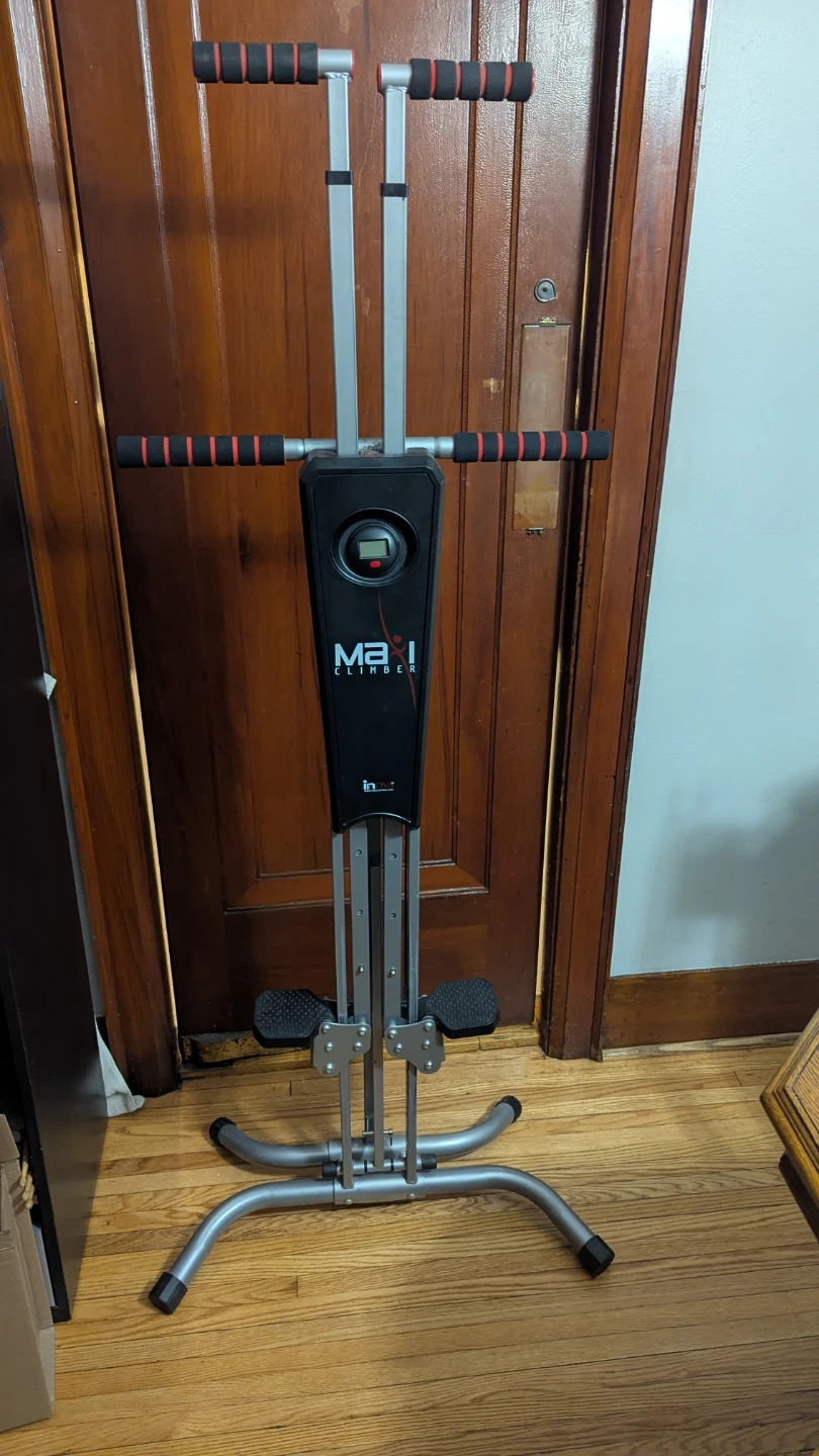 This is a Maxi Climber vertical stepper machine. It's made of metal and has padded grips for comfort. It features a small digital display to track your workout. This machine is great for a full-body workout at home.