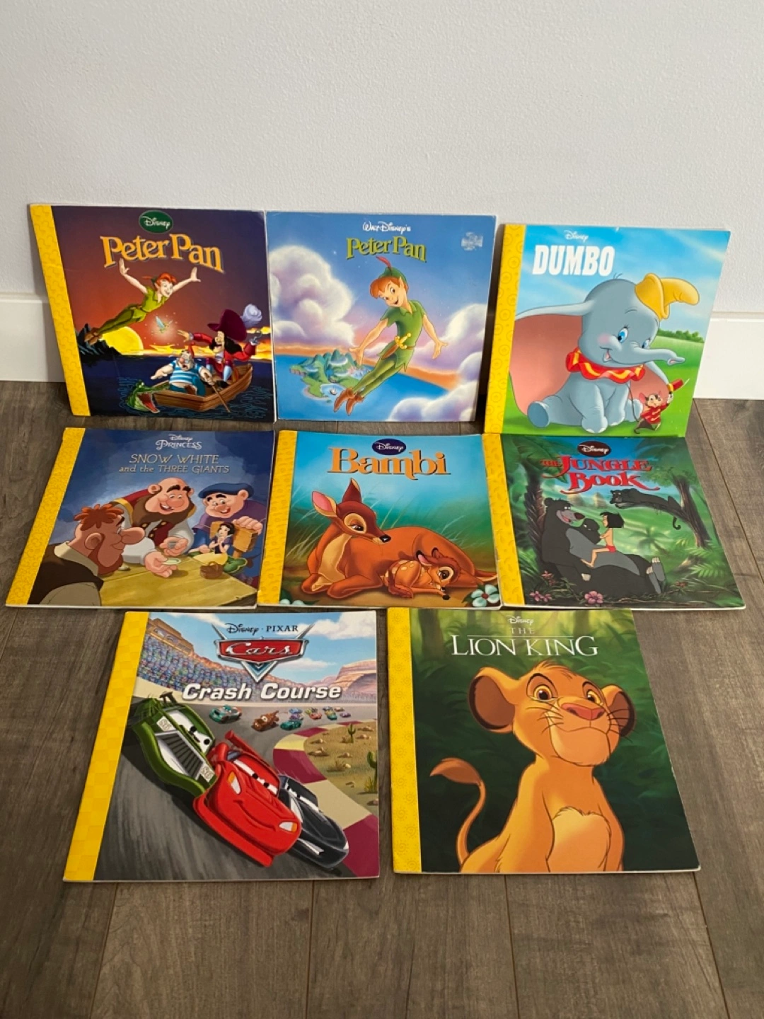 This is a collection of 7 Disney story books featuring beloved characters. Titles include Peter Pan (two versions), Dumbo, Snow White and the Seven Dwarfs, Bambi, The Jungle Book, and Cars: Crash Course. These books are perfect for young Disney fans to enjoy classic tales.