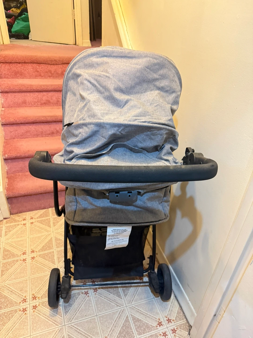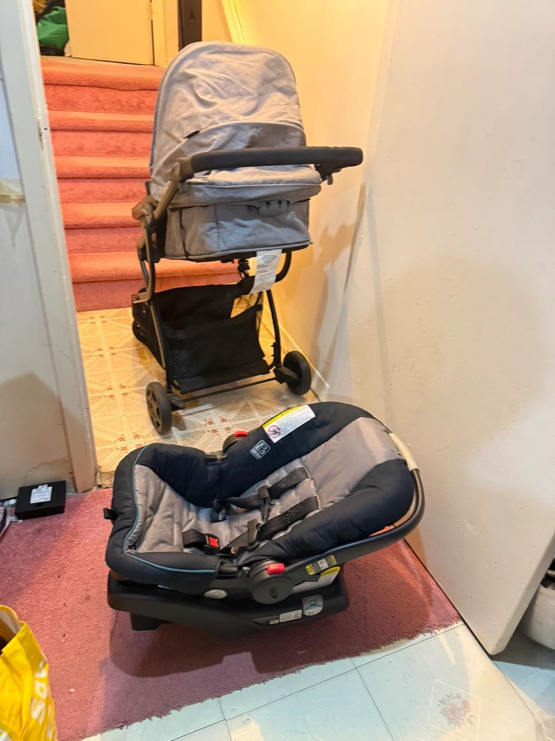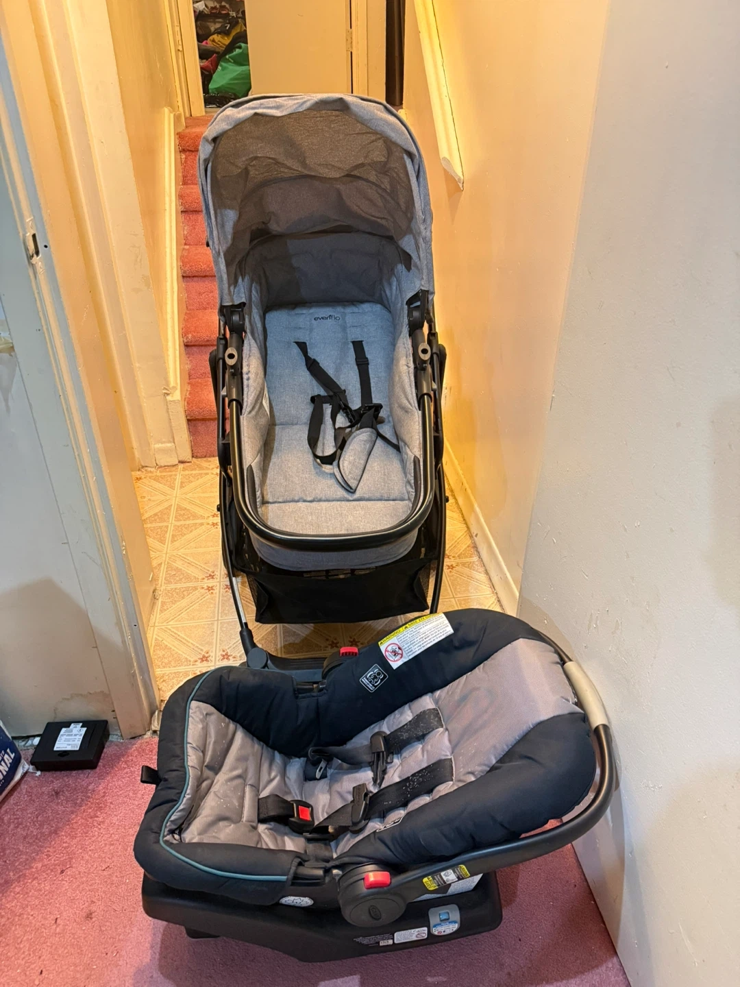 This Evenflo stroller and car seat travel system comes in a nice grey colour. It's perfect for getting your little one around town safely. The car seat includes a base for easy installation.
