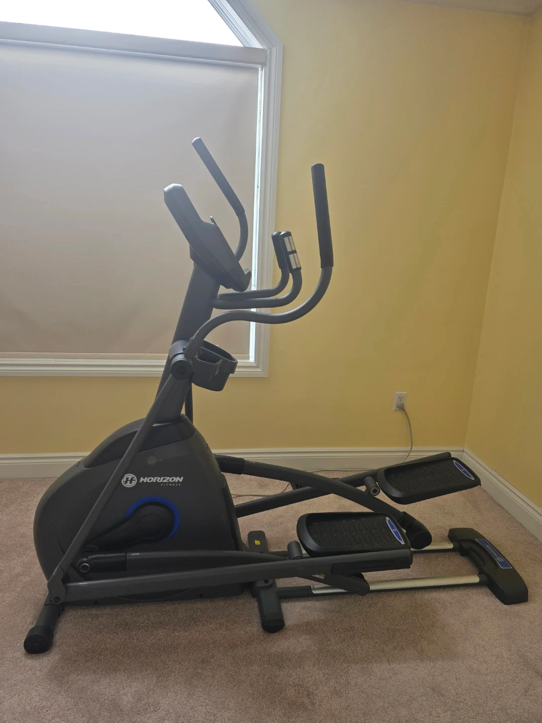 Horizon Fitness EX-59 elliptical. This machine offers Bluetooth wireless speakers and FLATTellipse stride motion. It's designed for home workouts. Includes the owner's manual.