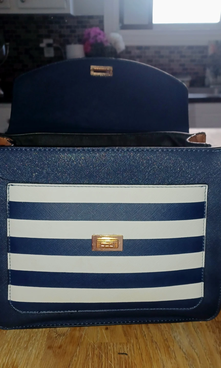 A stylish navy blue and brown shoulder bag! It features a cute pompom and leaf keychain. The inside has a striped pattern. Perfect for adding a touch of elegance to any outfit