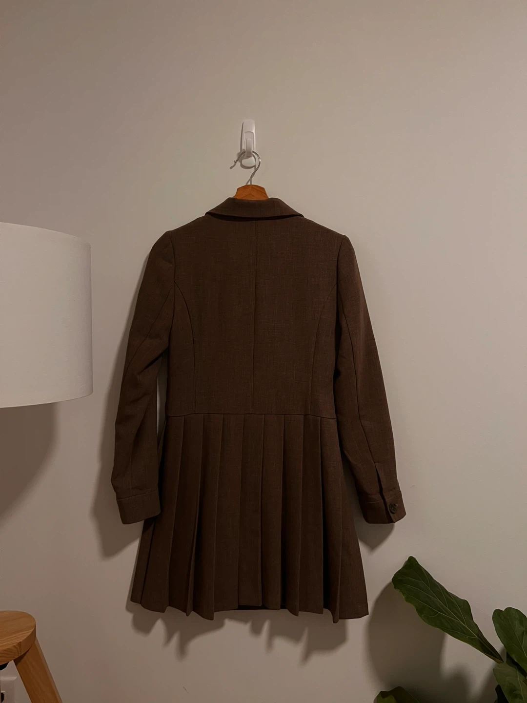 This is a stylish brown dress coat from Korea. It features a double-breasted design and a pleated skirt. Perfect for adding a touch of sophistication to any outfit!