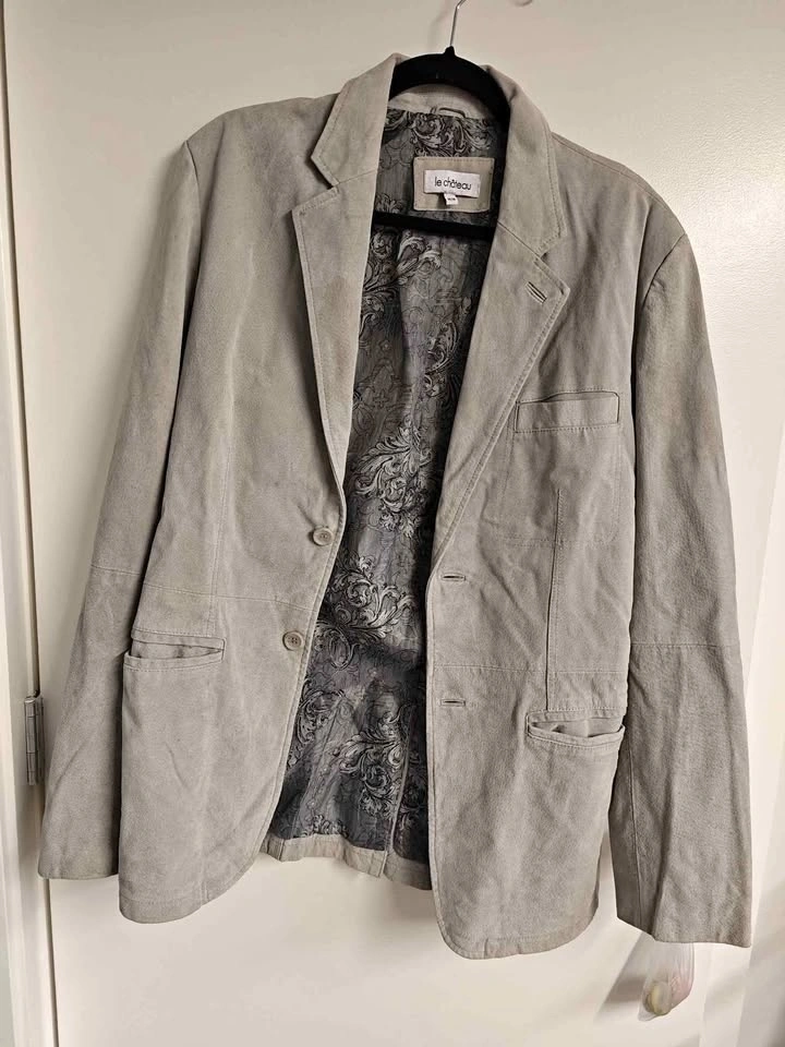 Grey suede blazer, Men's size Medium. Good condition. Wrinkles are from storage in a suitcase. Pick up can be arranged in North Delta, Burnaby, or Richmond on certain days/times.