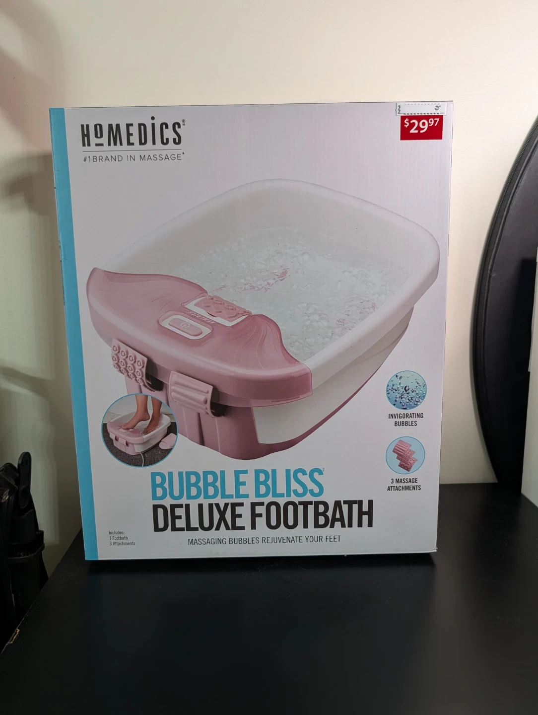 HoMedics Bubble Bliss Deluxe Footbath with invigorating bubbles. It includes 1 footbath and 3 massage attachments.