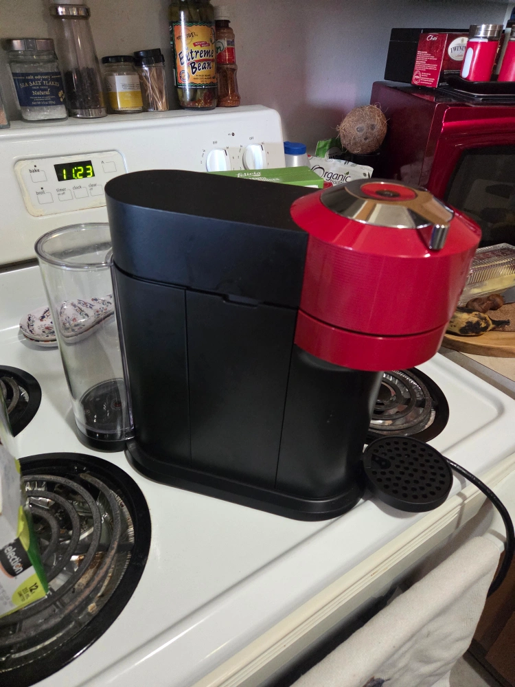 Selling a Nespresso Vertuo Next coffee machine! It's in great shape and ready to make delicious coffee. It's a sleek red and black colour, and also comes with a Breville base!