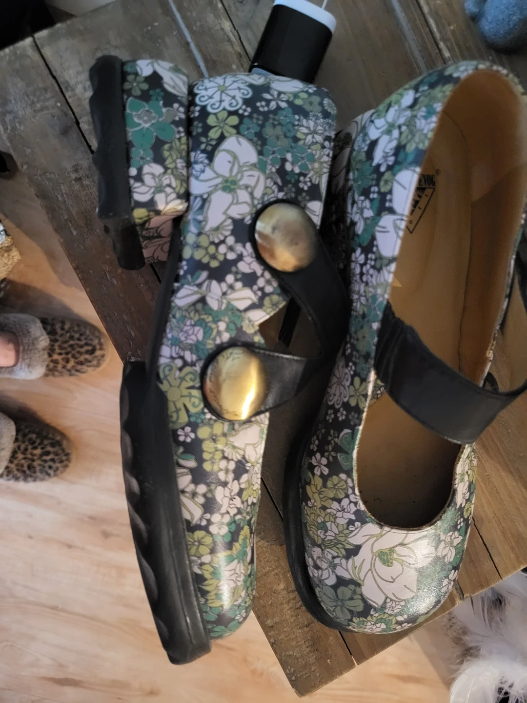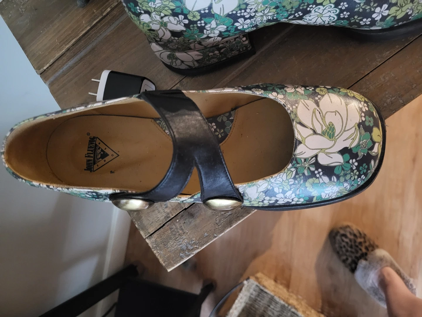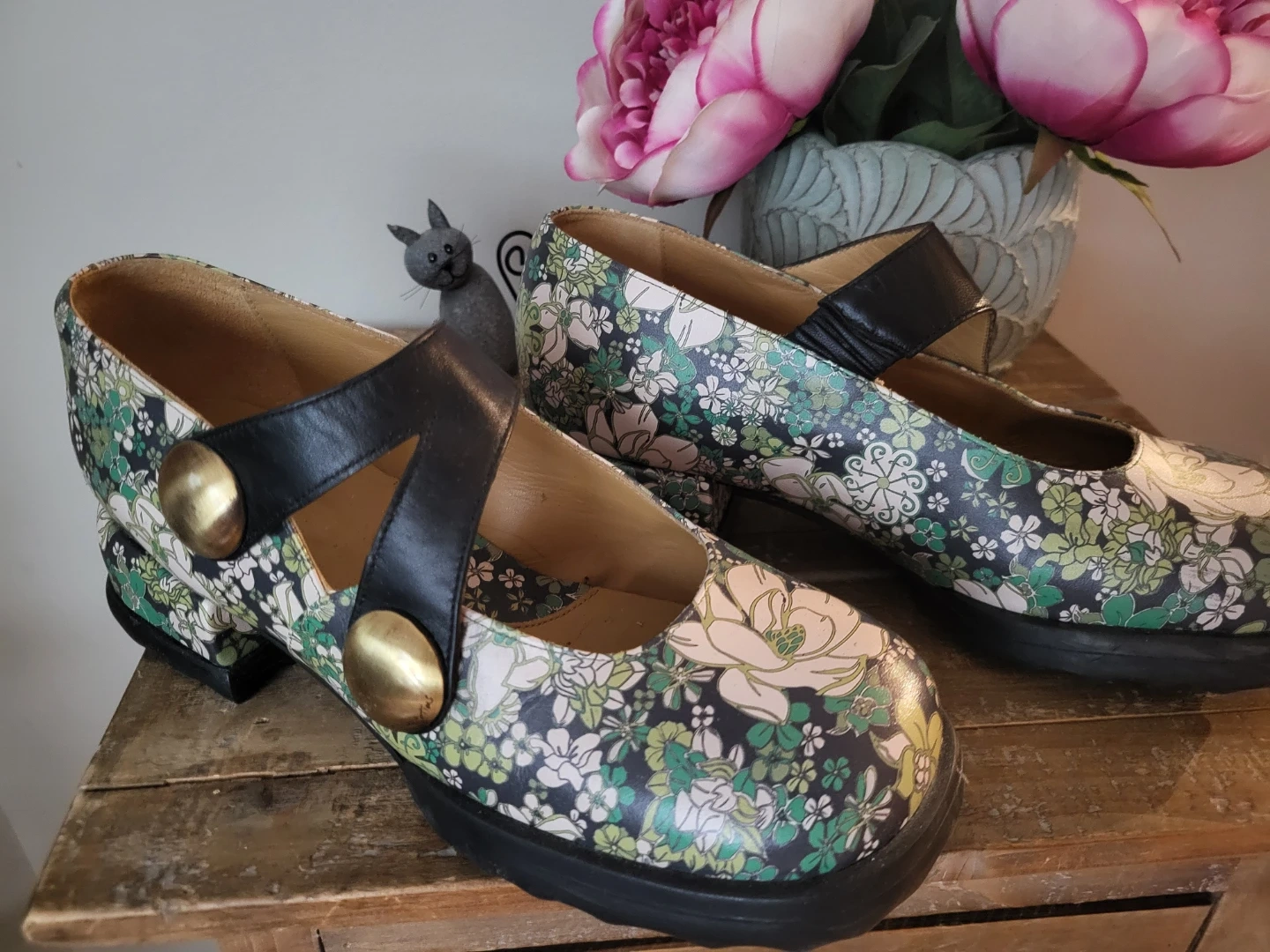 These John Fluevog Mary Janes feature a black and green floral print with black leather straps and gold-tone hardware. They have a chunky platform sole. Great for adding a unique touch to an outfit! They have only been worn a couple of times, I bought them a size too small by mistake. They are a women's size 8. An amazing shoe that will last