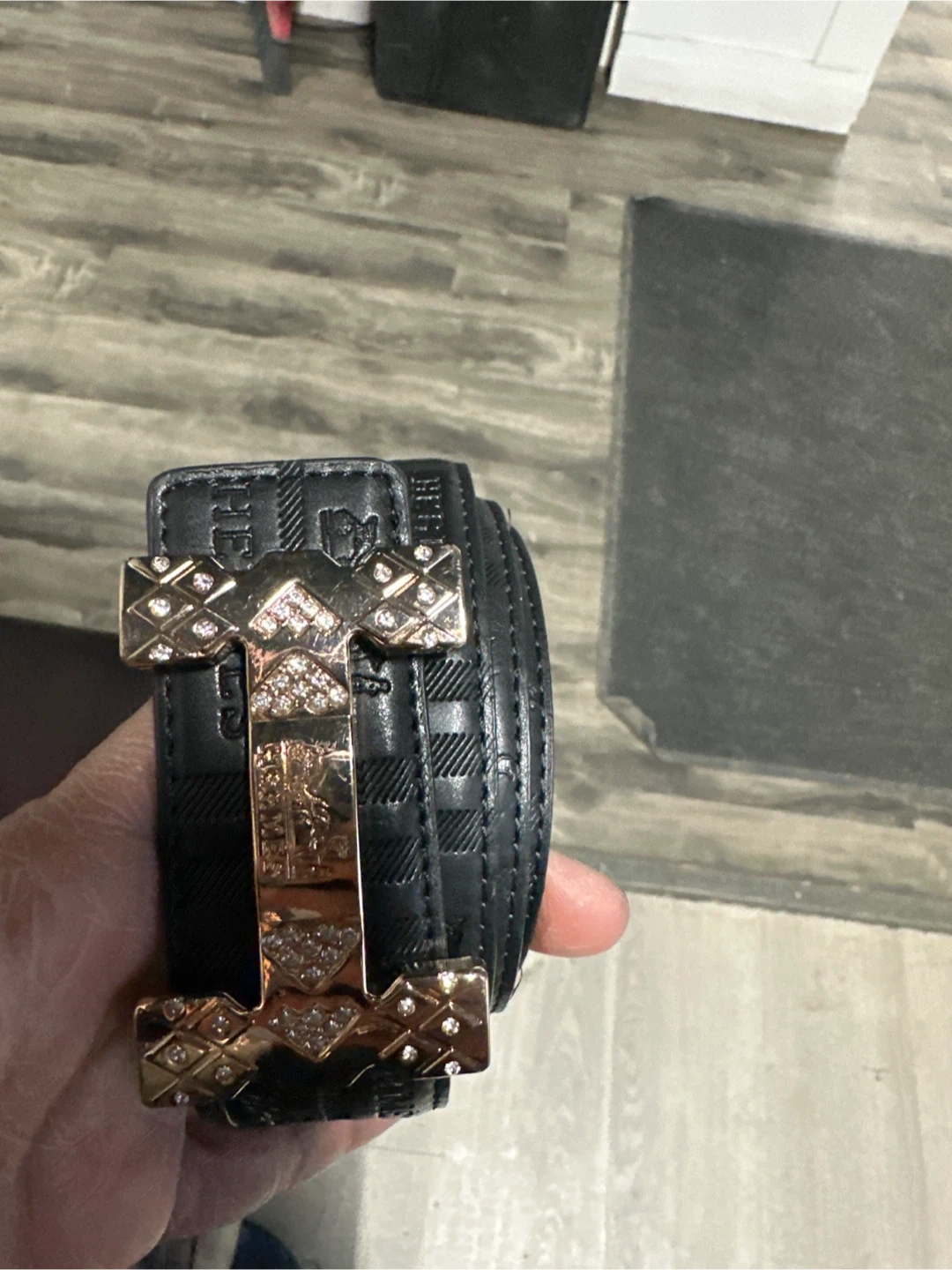 Selling a black belt with a unique 'The Hhe' buckle design. The buckle is adorned with rhinestones, adding a touch of sparkle. The belt itself has a textured pattern. It's in great condition and ready to add some flair to your wardrobe!