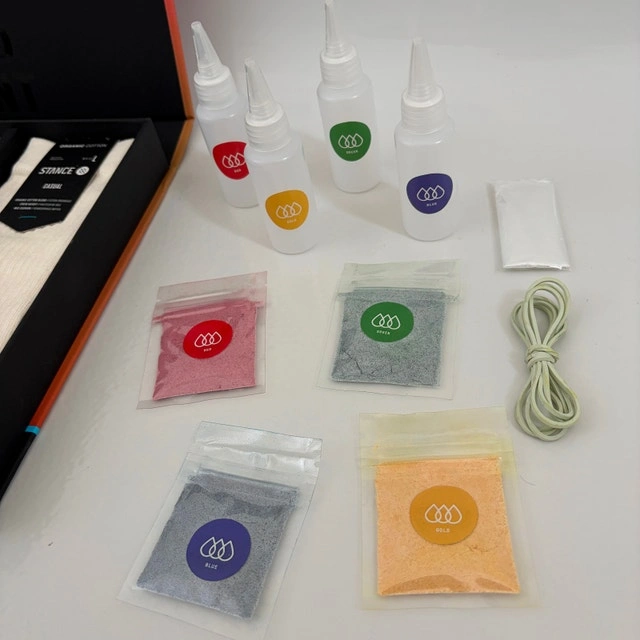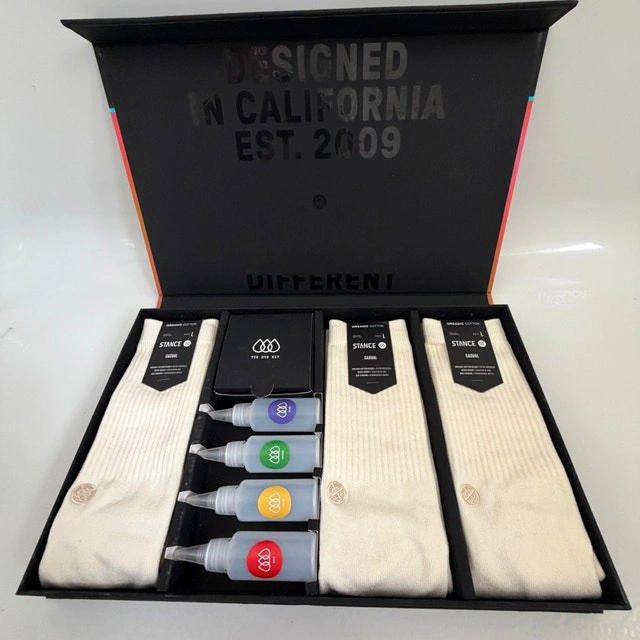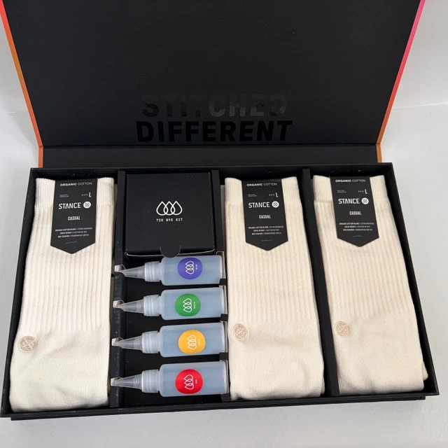 Brand new Stance Icon Tie Dye Box Set (Size L 9–13). Includes 3 organic cotton crew socks and complete DIY tie dye kit in premium presentation box. Never used. This limited Stance set lets you customize your own socks using the included dye bottles and powders (Red, Blue, Green, Gold). Designed in California. Est. 2009. A unique gift for sneakerheads, streetwear fans, or anyone into DIY fashion. CONDITION: ✅ Brand new ✅ Complete kit ✅ All dye powders sealed ✅ Socks unworn (organic cotton) ✅ Premium magnetic presentation box DETAILS: ✅ 3-Pack Crew (Size L 9–13) ✅ Organic Cotton ✅ Includes bottles, dye powders, elastics ✅ “Designed in California” edition Selling for $60 firm. Pickup location in Etobicoke near Gardiner Expy (by Park Lawn).