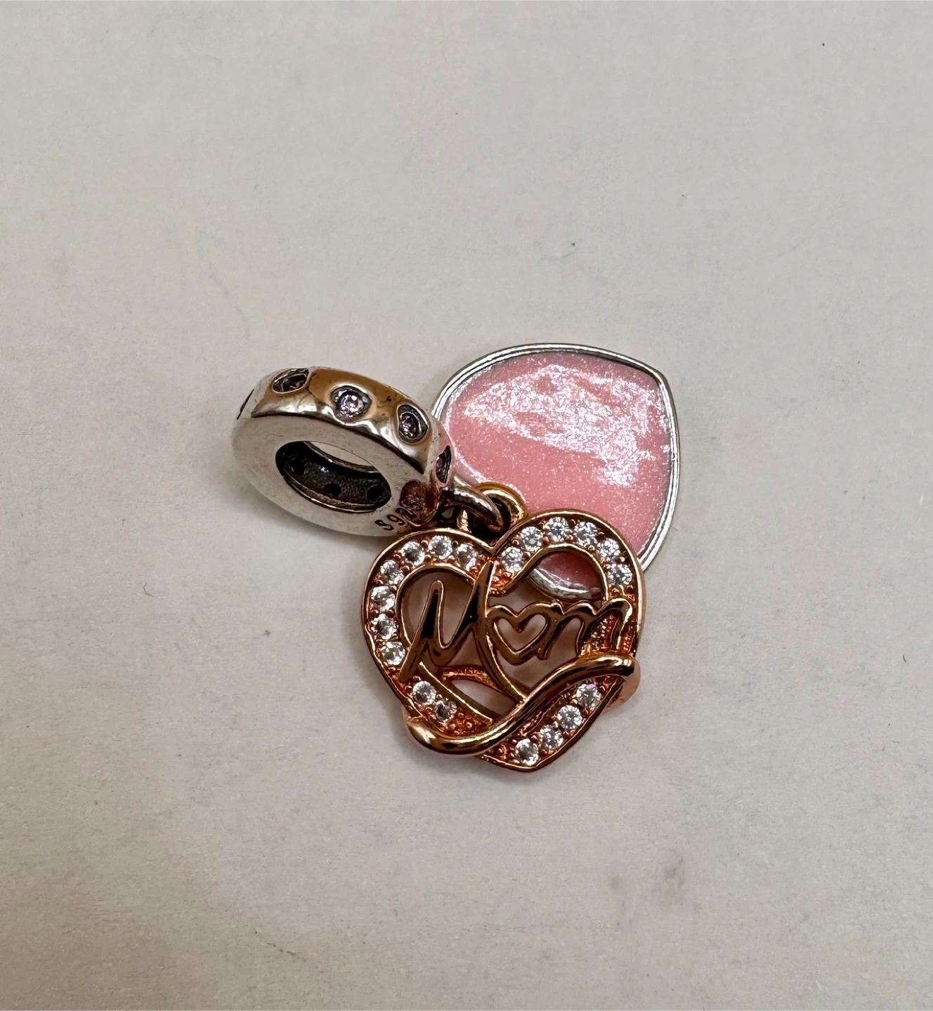 This is a charm pendant with a heart design and the word 'Mom' inscribed. It's adorned with sparkling stones and has a pink enamel finish. The bail is marked S925. It's a lovely piece for Mother's Day or any occasion to show appreciation.