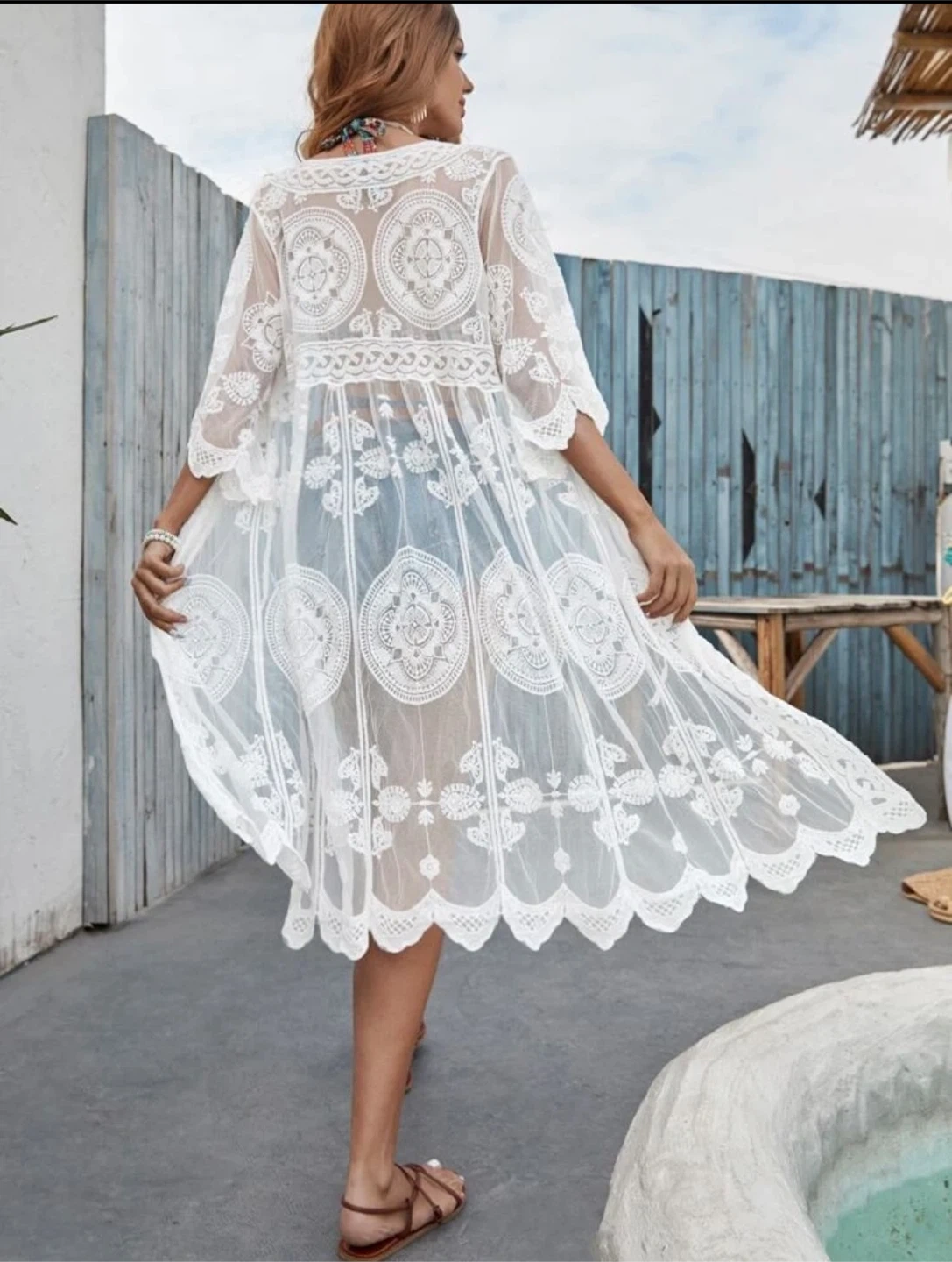 This white lace kimono cover-up features intricate patterns and a flowy design. It's made of sheer lace material with a tie closure at the front. The sleeves are wide and flared. Perfect for layering over swimwear at the beach or pool!