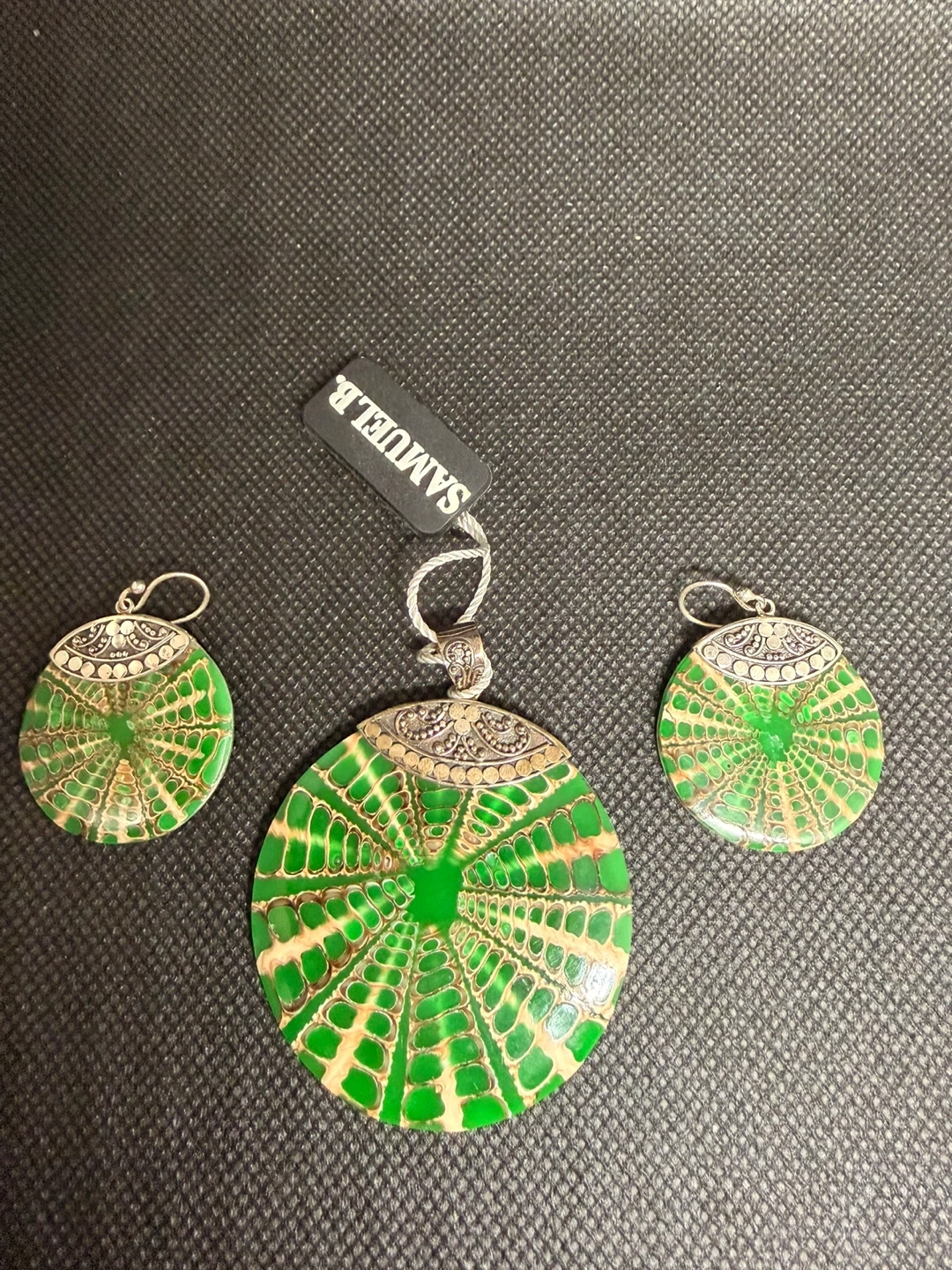This is a Samuel B. pendant and matching earrings set. The set features a unique green and tan patterned design with silver-tone accents. Great for adding a pop of colour to your outfit!