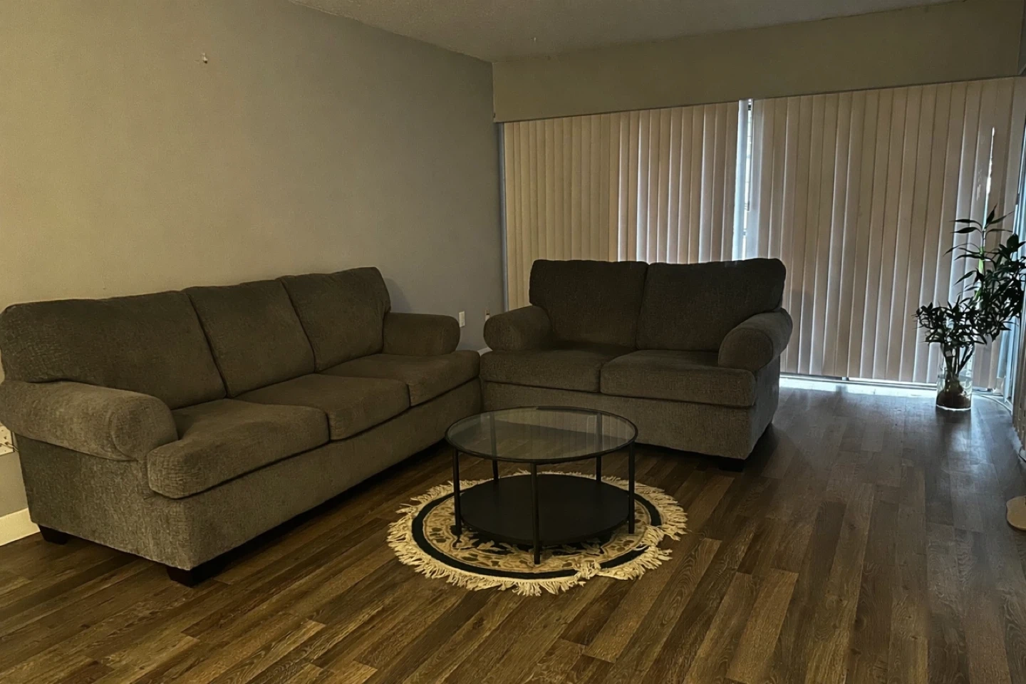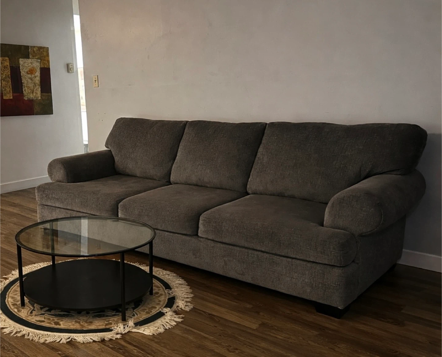 Comfortable dark grey fabric sofa and loveseat set. Cushions are plush and offer good support. This set's neutral colour makes it easy to match with existing decor.