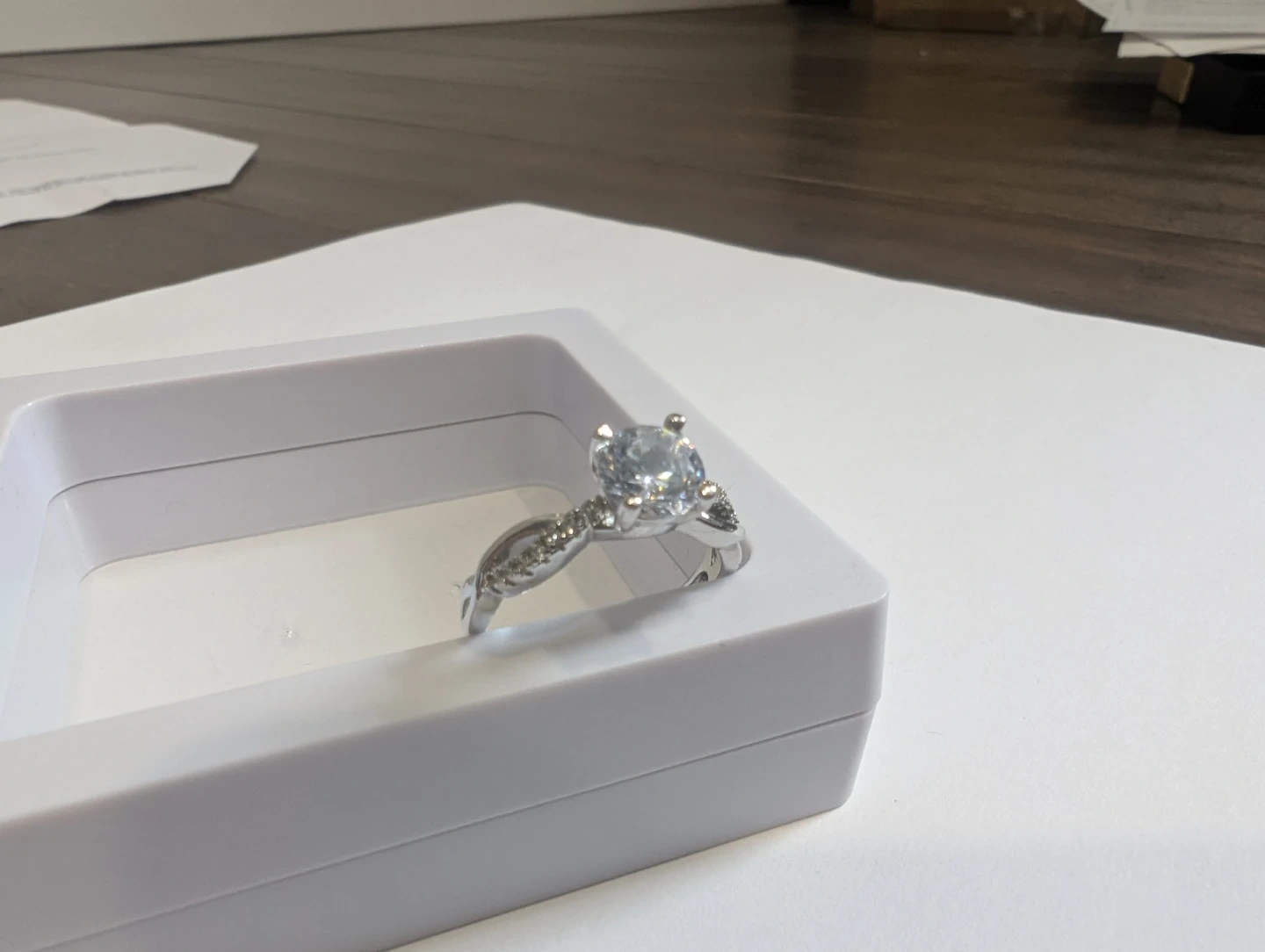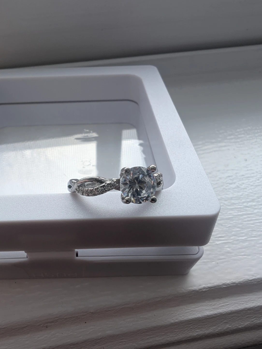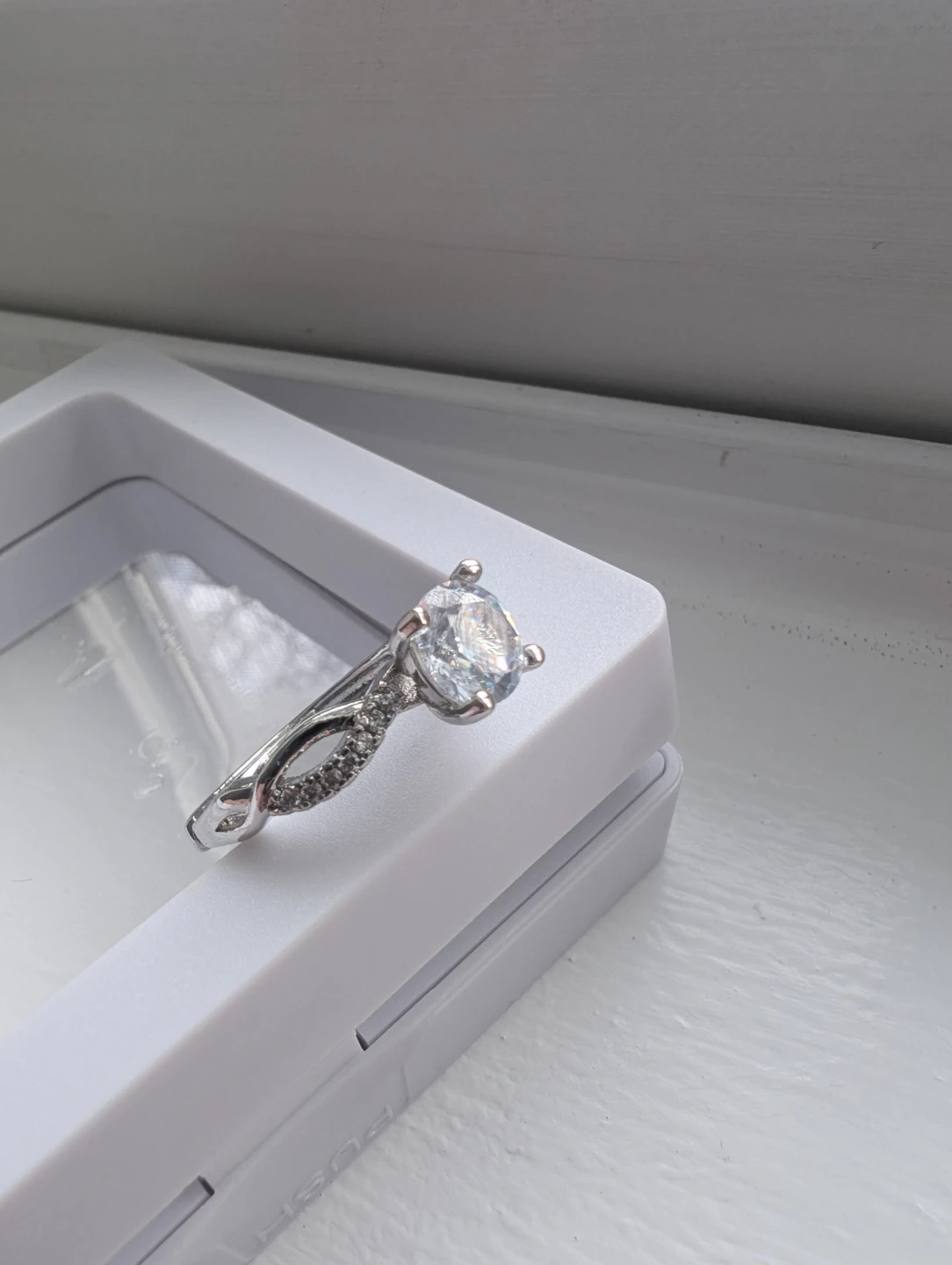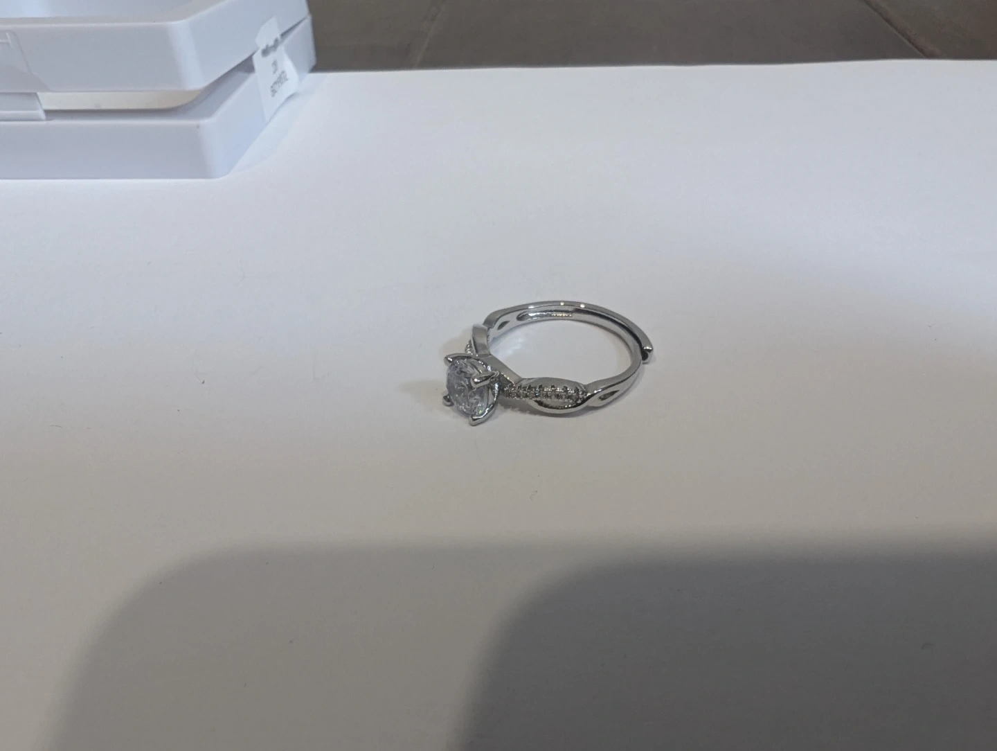 Brand new base metal moissanite diamond ring for sale. Moissanite gemstone, Adjustable fold over ring size, $220 FIRM. Comes with appraisal.