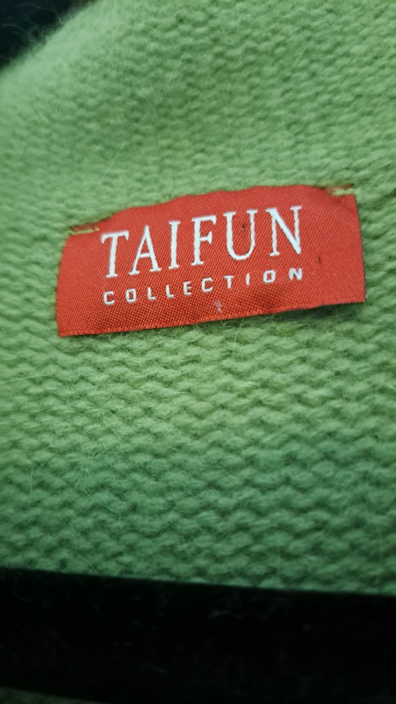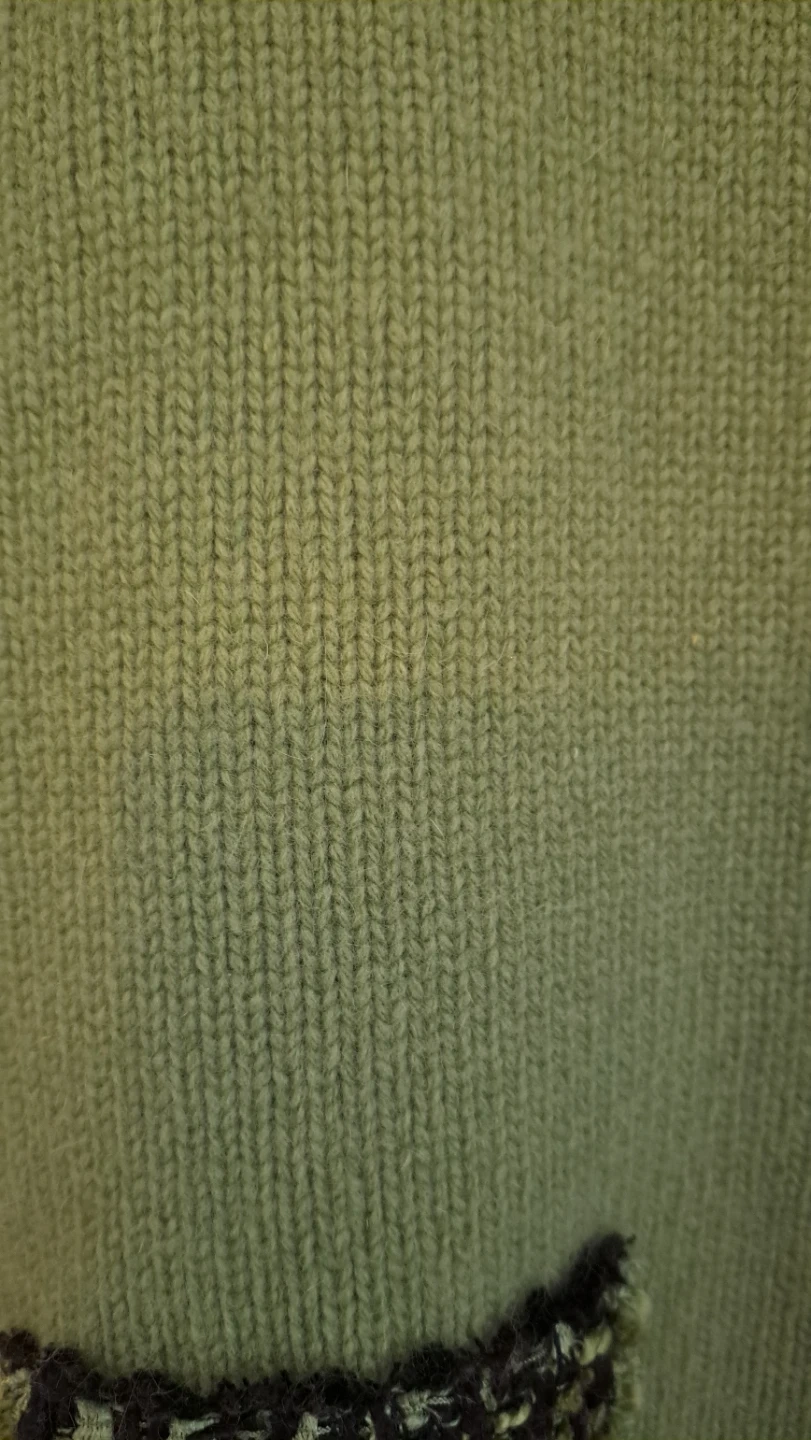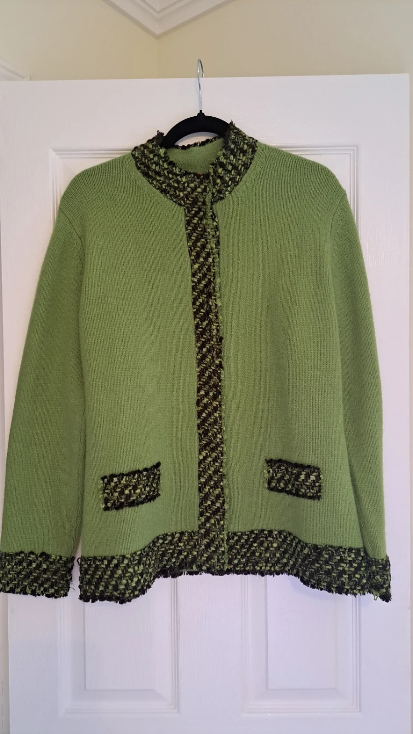 A cozy green knit cardigan featuring a textured trim on the collar, cuffs, and pockets. It's designed with a classic button-up front. This cardigan is great for layering over outfits.it's made from wool.