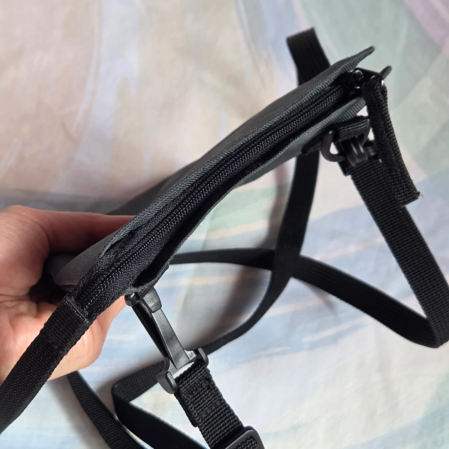Features a zippered closure, adjustable strap and water repellent coating