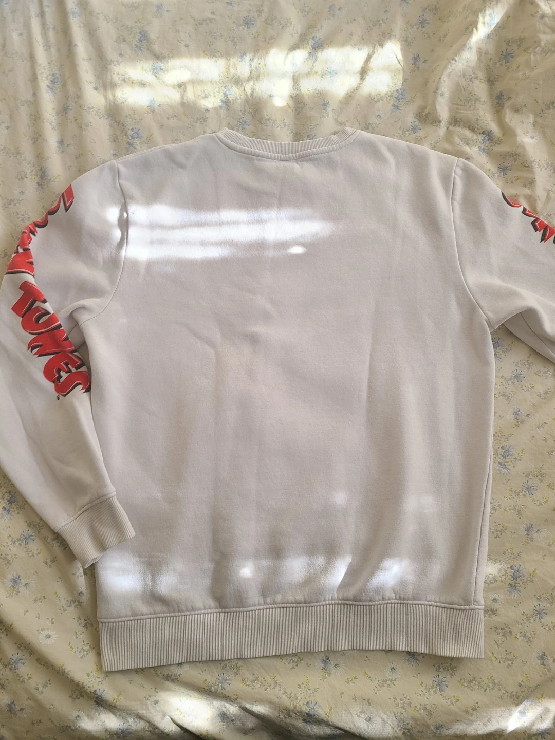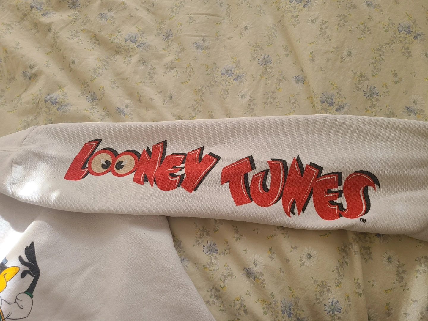 White sweatshirt with a large graphic print of "Looney Tunes" on the front. Made from a soft cotton blend. Like new condition.