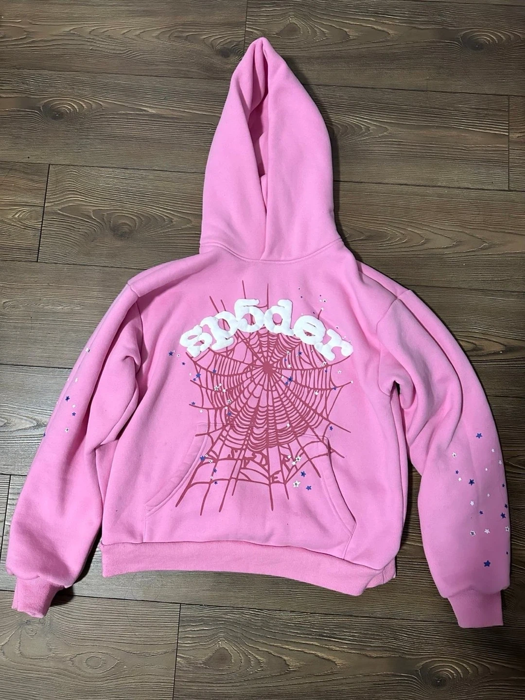 Selling a pink Sp5der hoodie with a web design. It's in great condition and ready for a new owner! Have all sizes and different colours as well