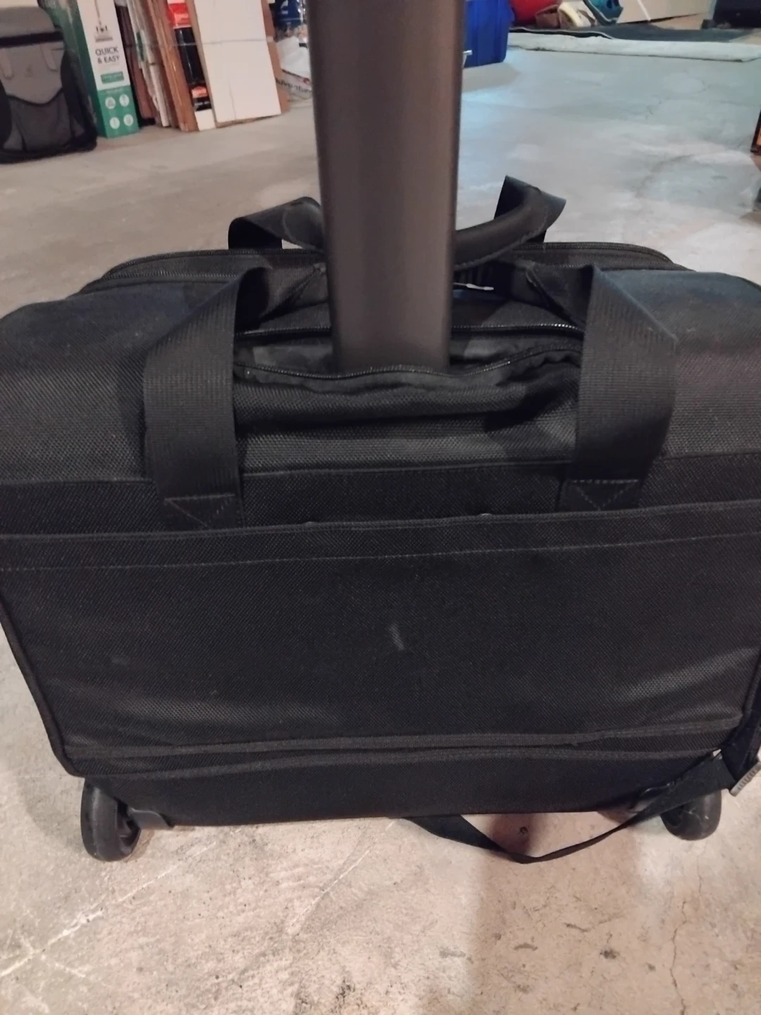 Victorinox rolling briefcase in black. It's made from durable nylon material with a telescoping handle and wheels for easy transport. Multiple compartments offer plenty of storage for your essentials.