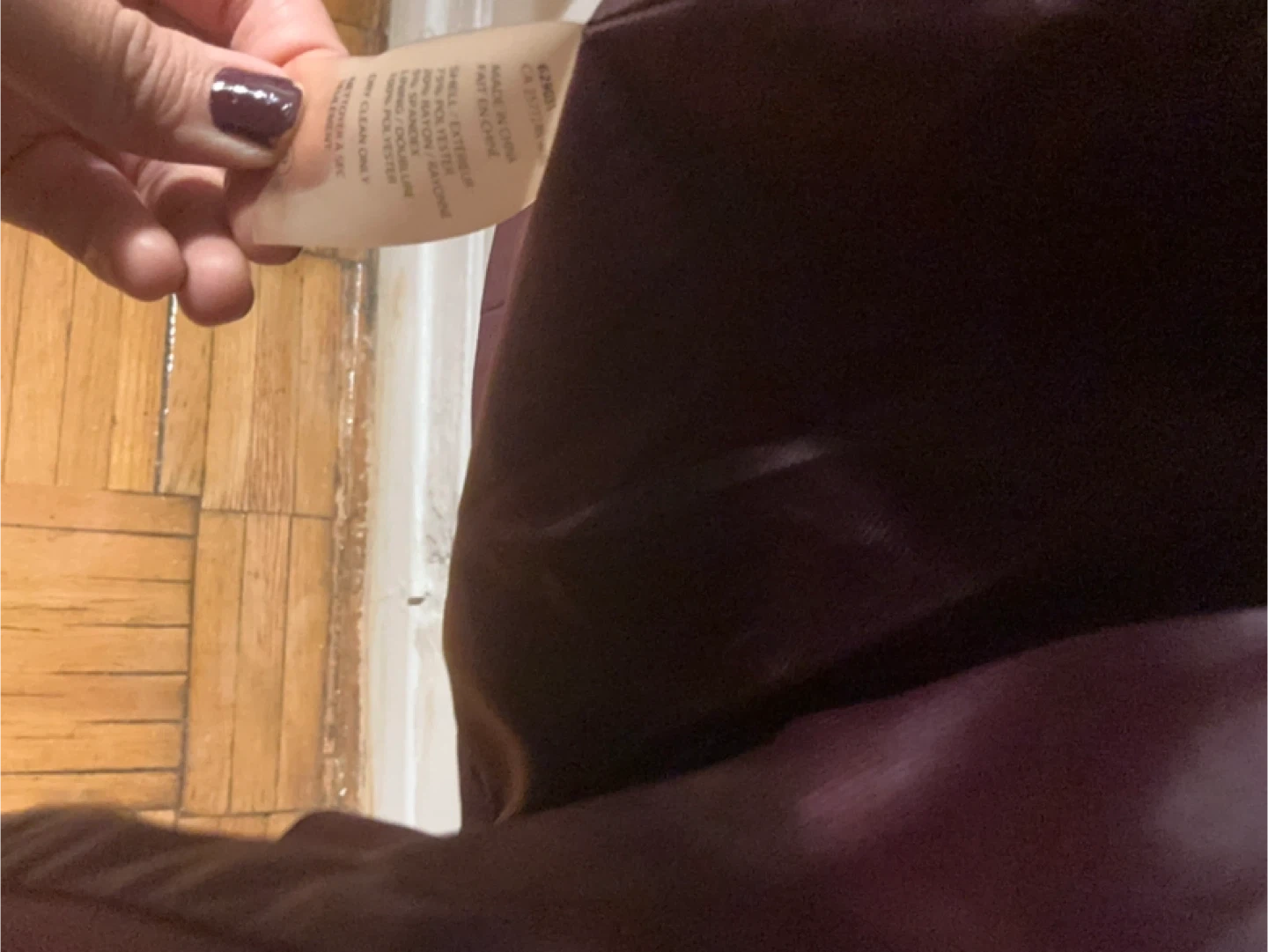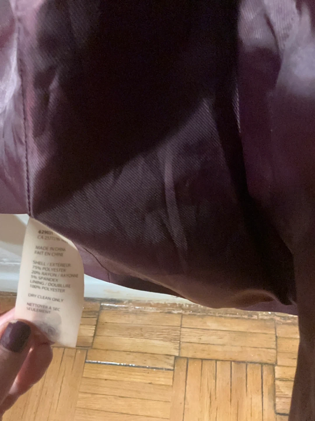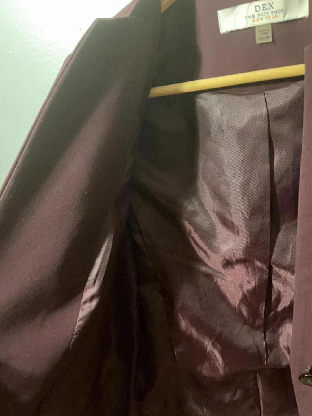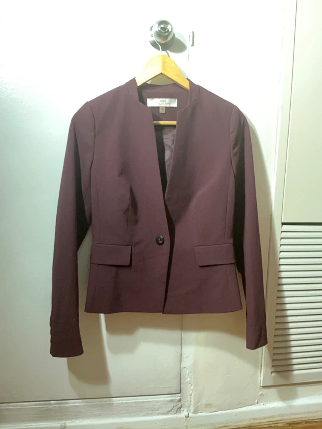 This is a plum coloured DEX blazer. It's made of a polyester and spandex blend. The lining is 100% polyester. It features a single button closure and two front pockets