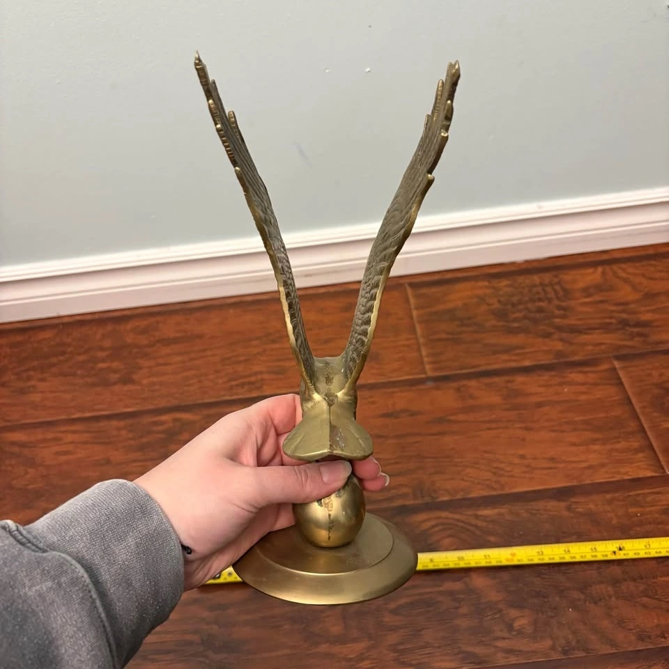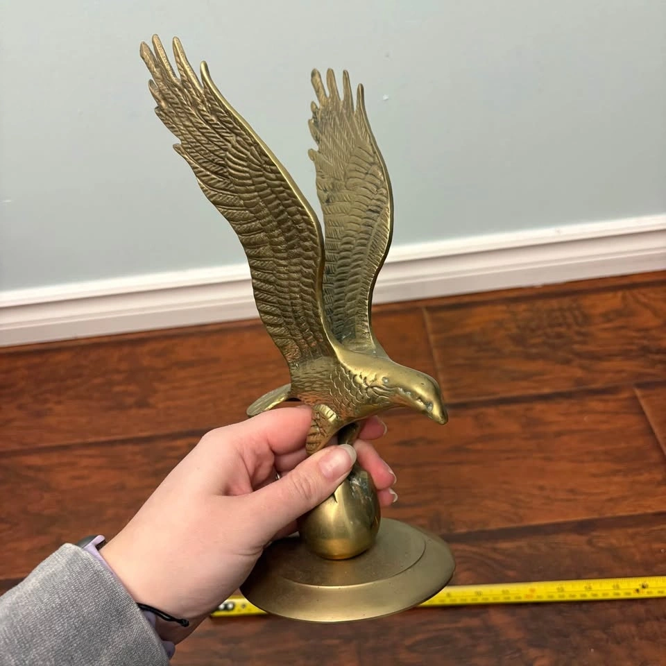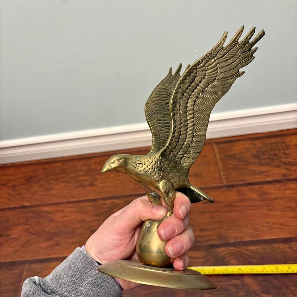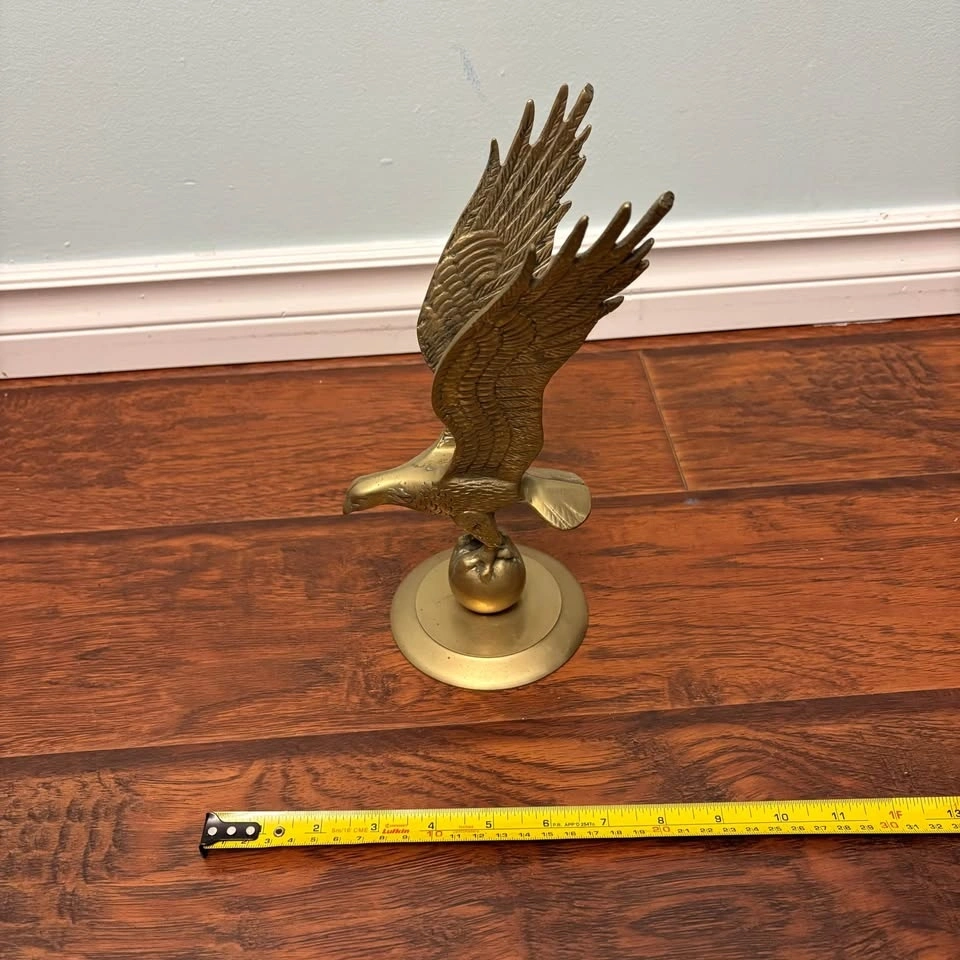 Solid brass eagle statue or figurine perched on a ball or sphere. Features a majestic eagle with wings spread wide, capturing a stance of authority. Primarily used as decorative home or office decor, or as a paperweight.