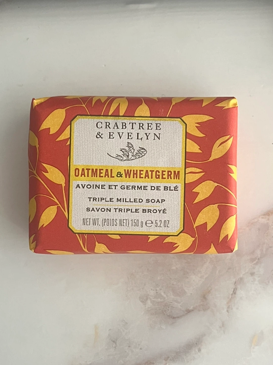 This is one bar of Crabtree & Evelyn Oatmeal & Wheatgerm triple milled soap. It weighs 150g or 5.2 oz. This soap is made with oatmeal and wheatgerm.