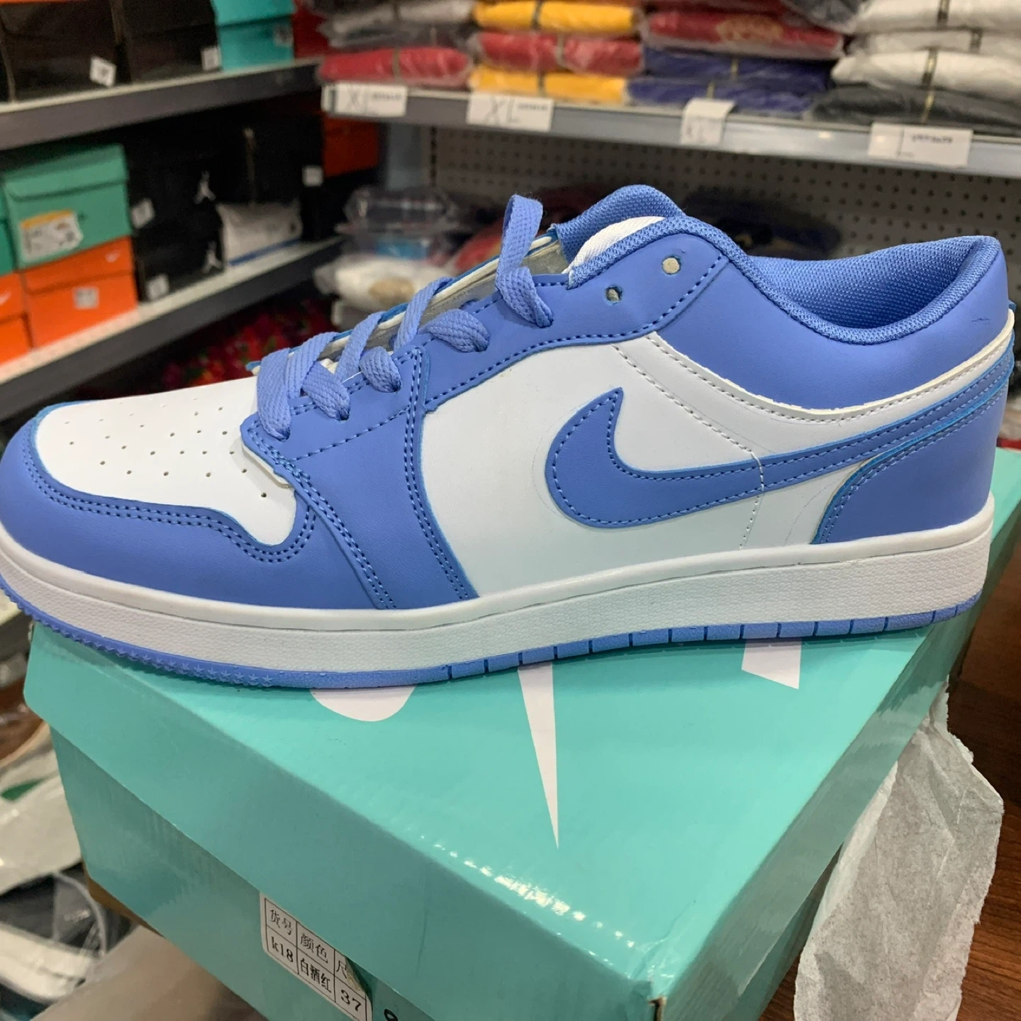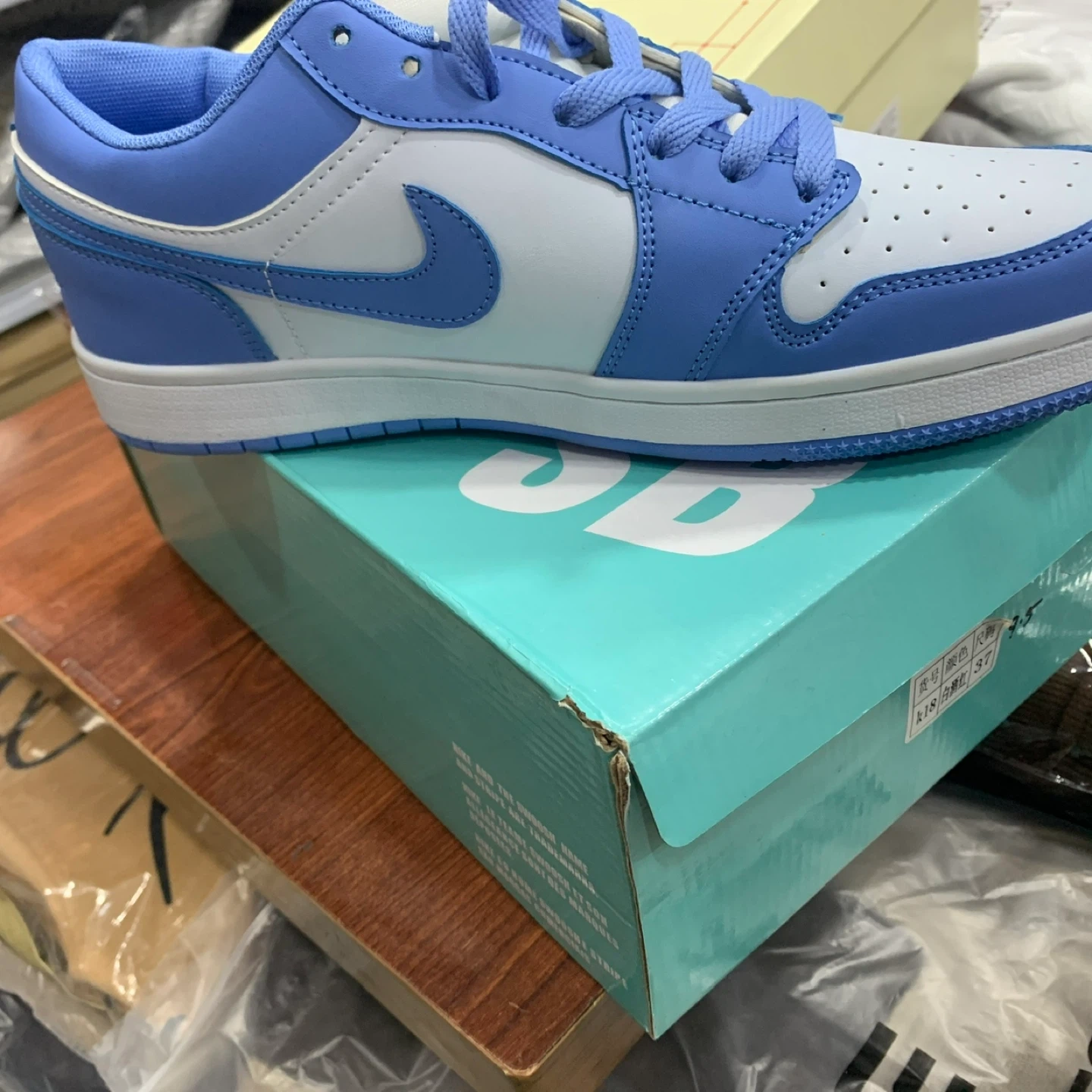 These Nike Air Jordan 1 Low SE sneakers come in a classic white and university blue colorway. They feature a leather construction with perforations on the toe box and a rubber outsole. Includes the original box. Size is 9.5.