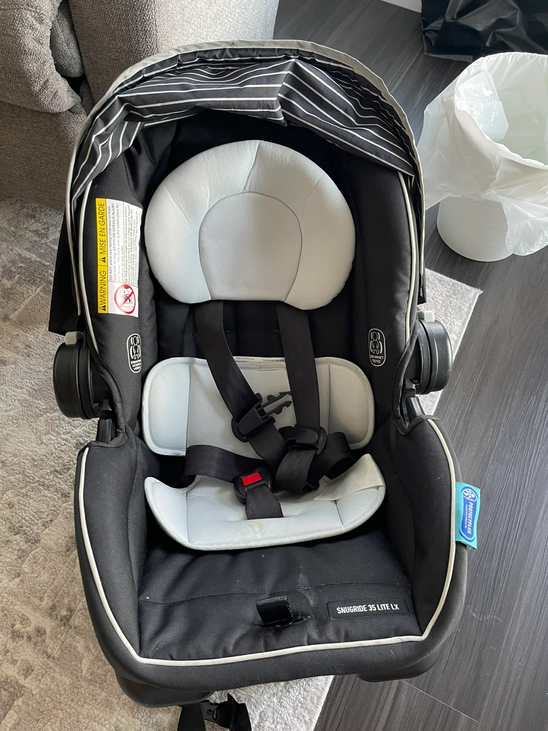 This is a Baby Trend SnugRide 35 Lite LX infant car seat. It's black with white and gray accents. It includes a padded headrest and harness system.