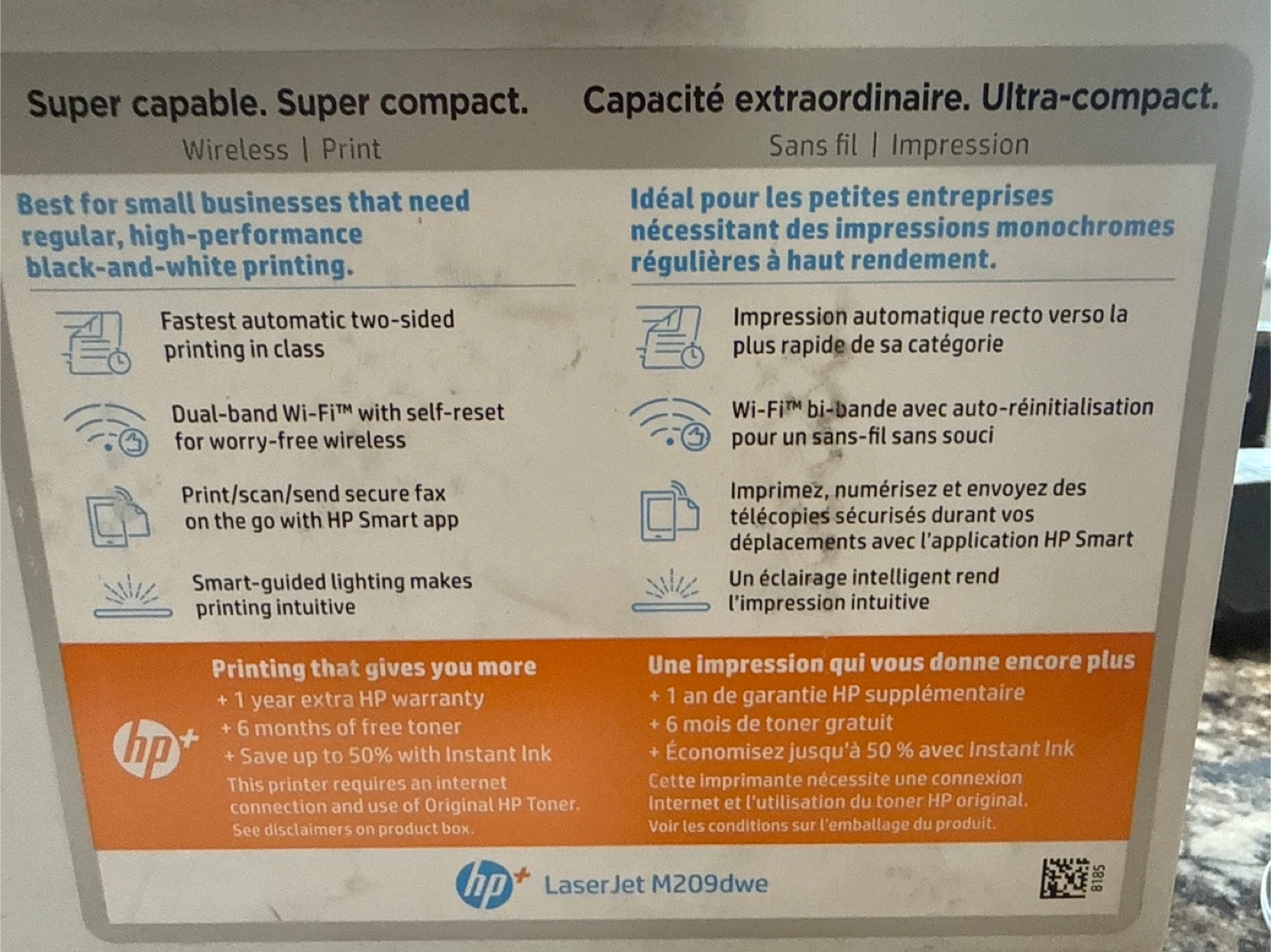 Looking to sell my HP LaserJet M209dwe printer. It's super capable and compact, perfect for small businesses needing regular, high-performance black-and-white printing.