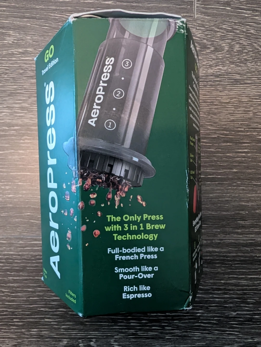 This is the AeroPress Go Travel Edition coffee press. It's a portable version of their iconic coffee maker. Includes the GO travel cup, scoop, stirrer, and filter holder. * Not include filter paper *