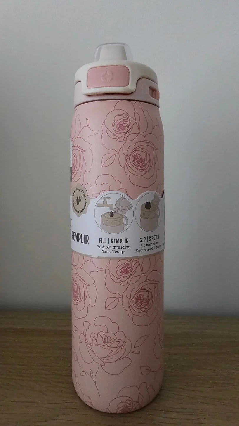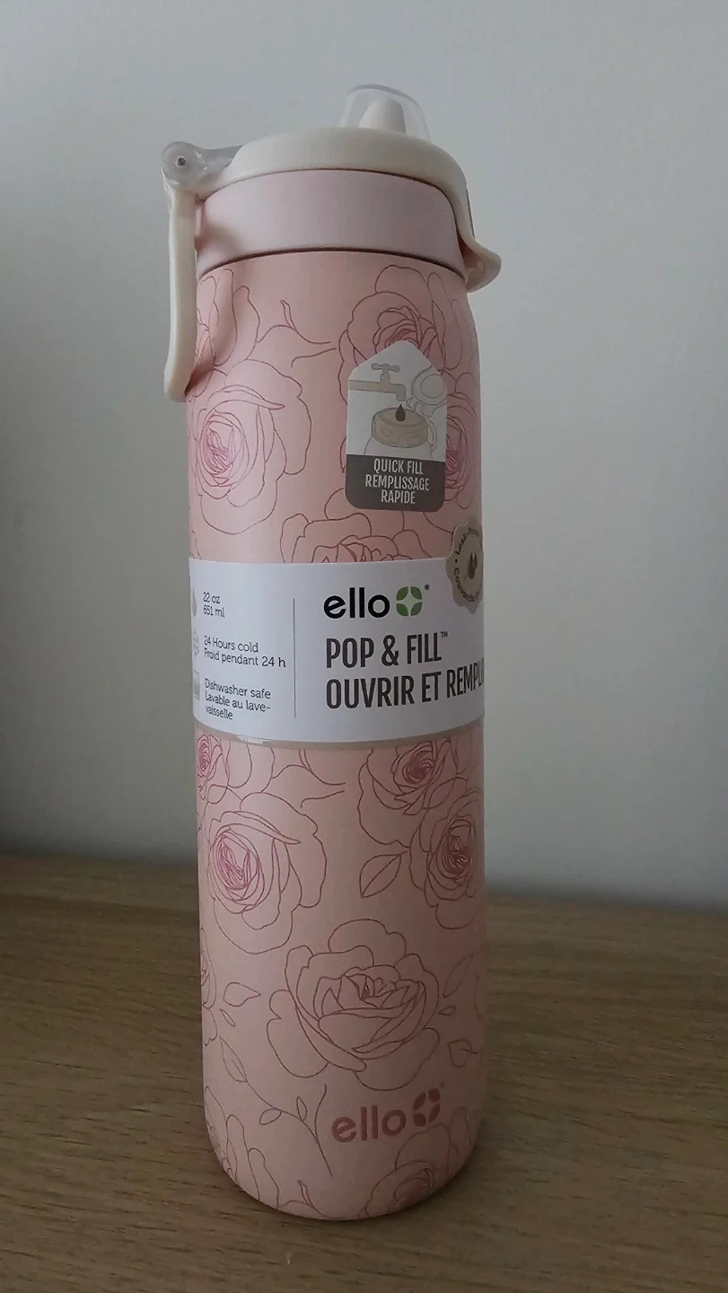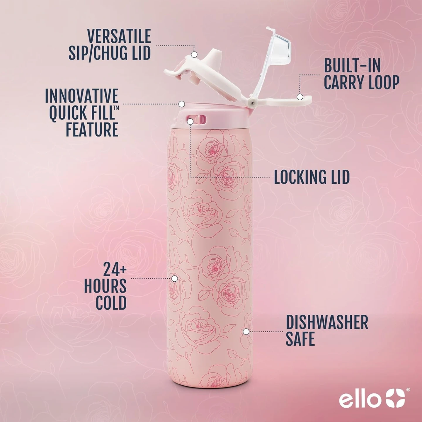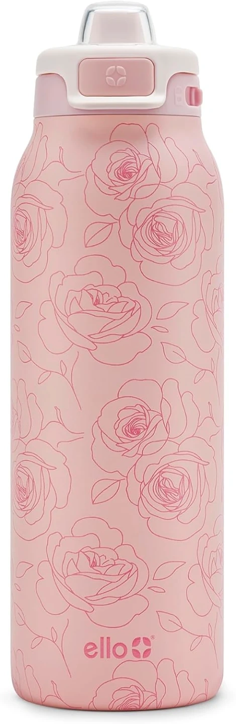 This Ello water bottle has a capacity of 22 oz. It keeps drinks cold for over 24 hours. The bottle is dishwasher safe and features a built-in carry loop.