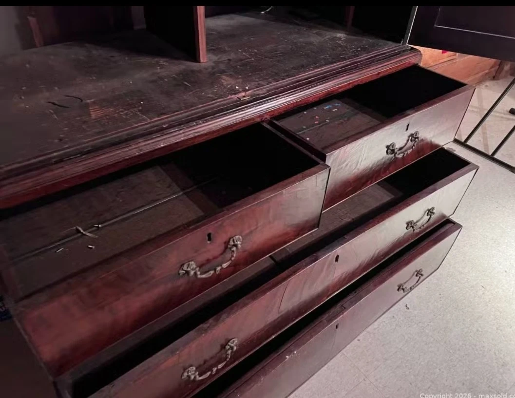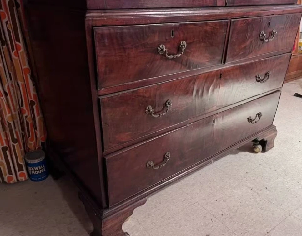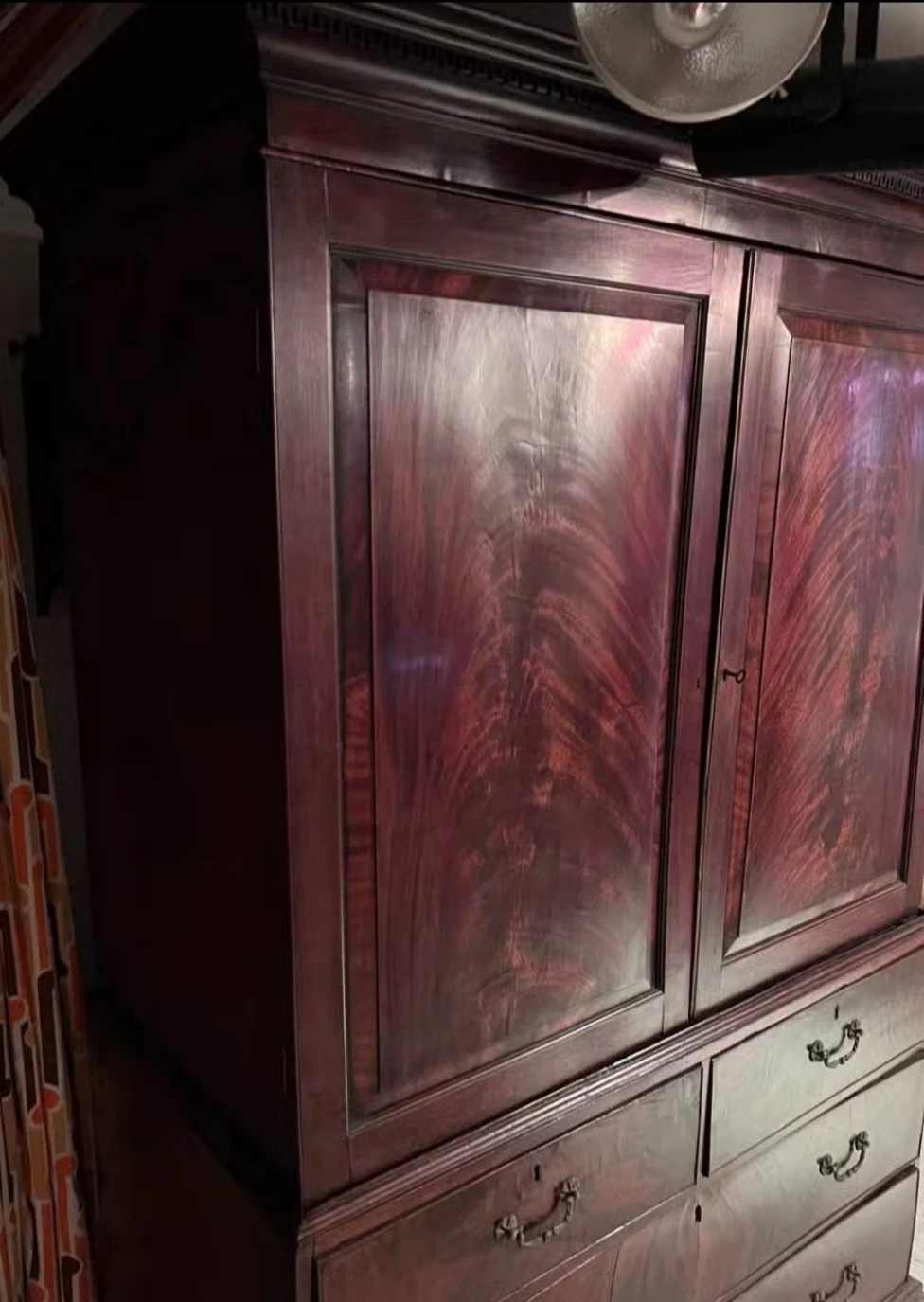 A beautiful antique mahogany chest of drawers with two cabinet doors on top. It features ornate brass hardware and a rich, deep wood grain. This piece offers ample storage with multiple drawers and cabinet space. It's perfect for a bedroom or living room needing a touch of vintage charm and substantial storage.